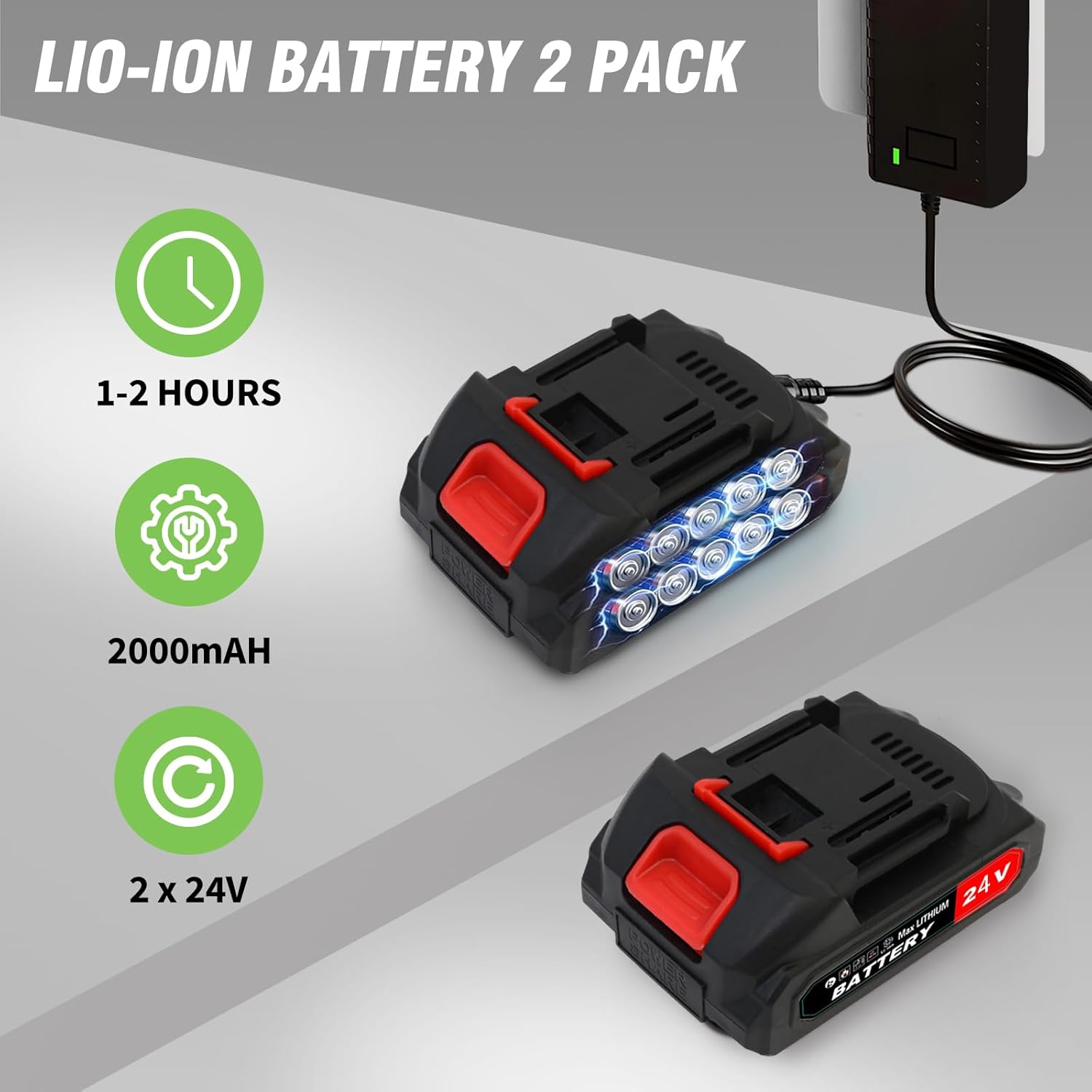 - High-Efficiency Performance: Powered by industrial-grade 24V/2000mAh lithium battery delivering 30 minutes of continuous operation at 18,000 RPM. Turbo-charged 1-hour recharge with dual batteries included for extended runtime. To preserve motor longevity, we suggest taking 15-minute cooling breaks when switching between batteries during prolonged use