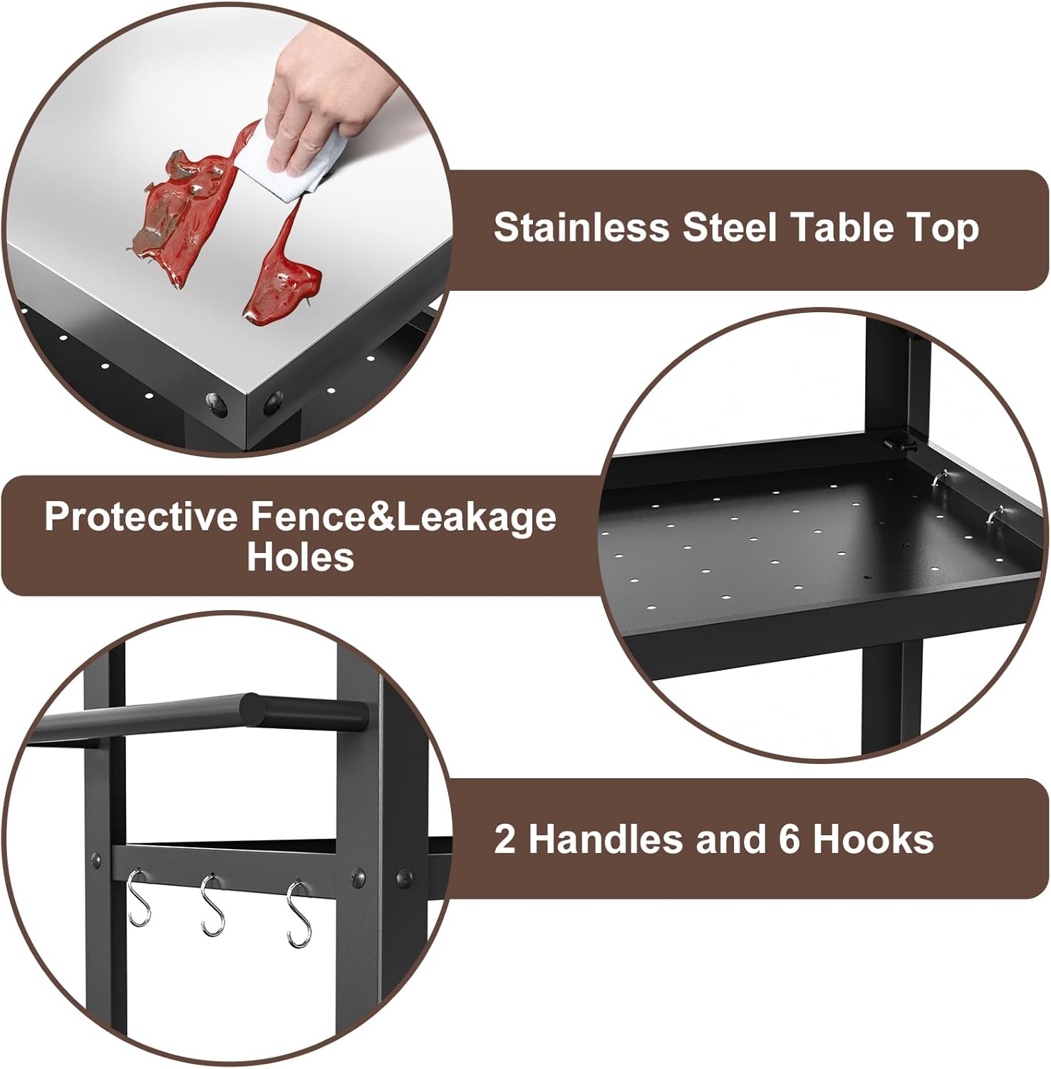 - Humanized Design: Our outdoor prep table has 2 handles and 6 hooks. You can move it in any direction and there are places for kitchenware and towels on both sides. The second shelf takes plates slipping off and accumulated water into consideration, which comes out the shelf with fences and weep holes.