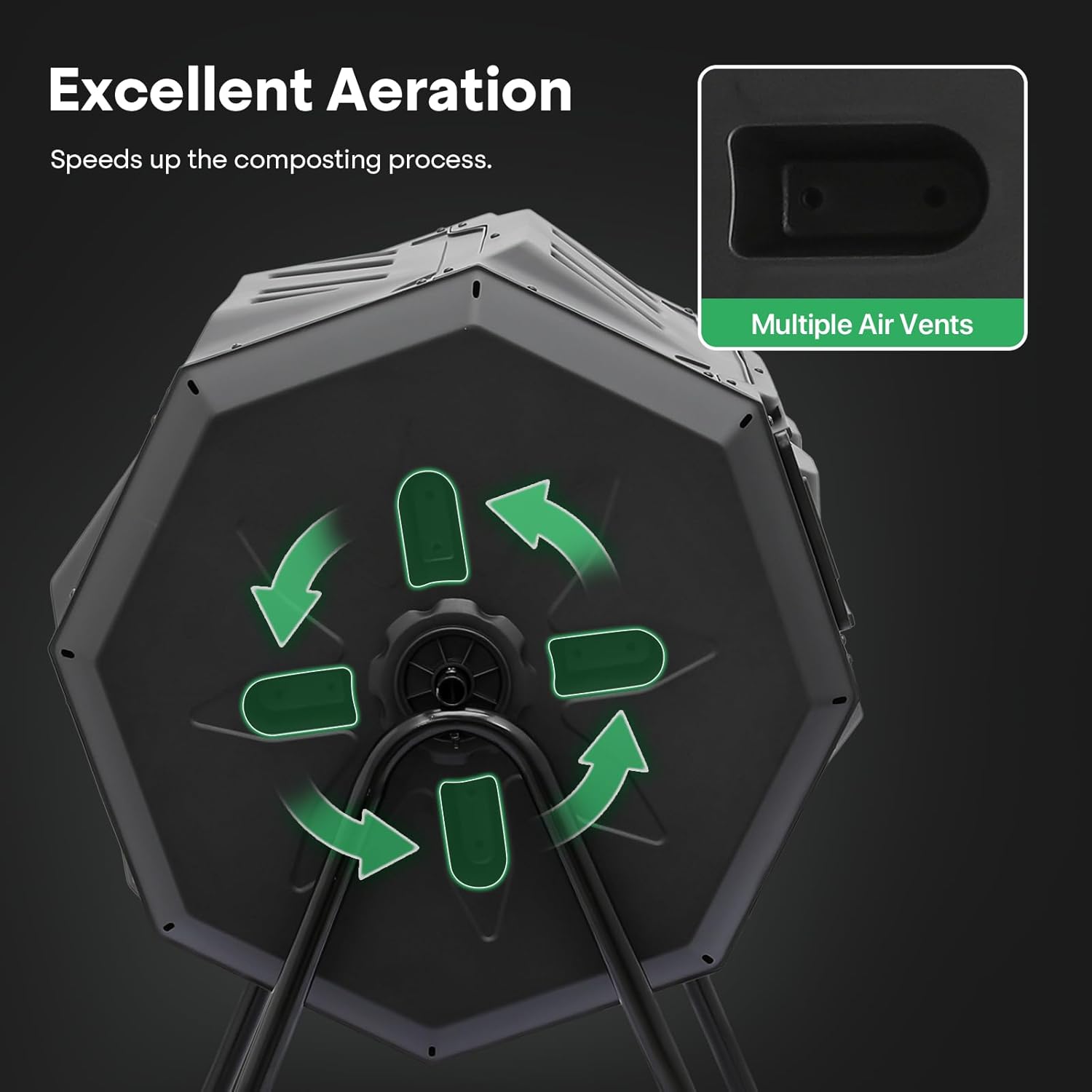 - Improved Air Circulation System: Integrated air vents and internal mixing fins improve airflow and help maintain an ideal balance of moisture and oxygen, which accelerates decomposition and keeps odors in check.