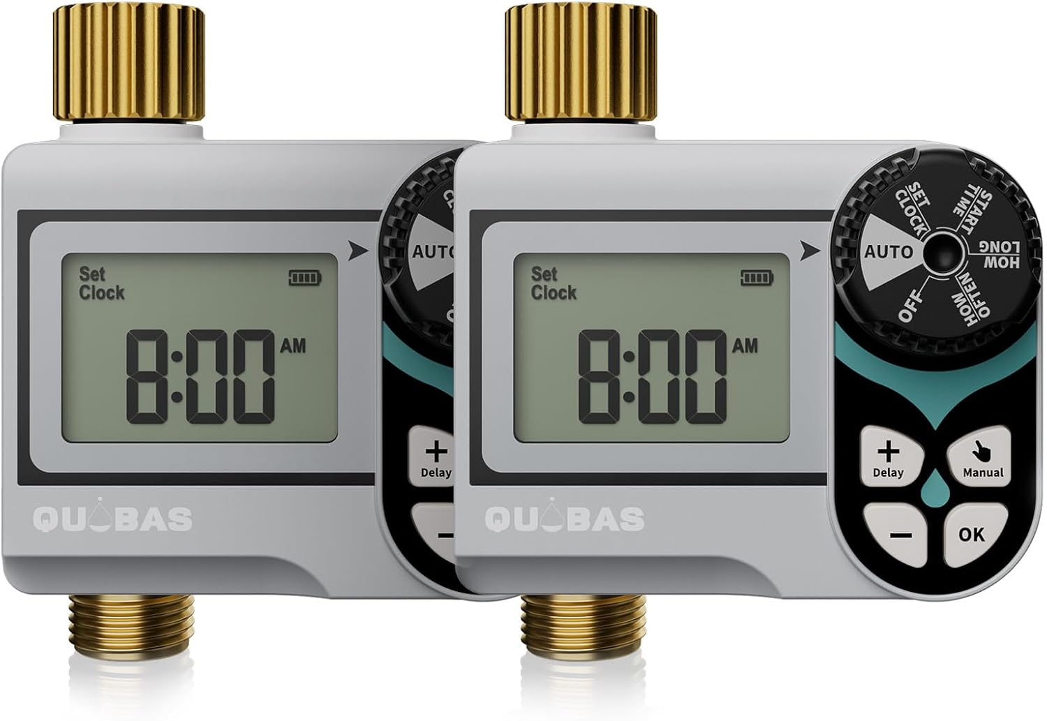 [2 Pack] QUOBAS Low Pressure Water Timer for Garden Hose, Automatic Sprinkler Timer with Brass Inlet & Outlet, Rain Delay/Manual Watering/Automatic Watering System for Yard, Lawn, and Rain Barrel