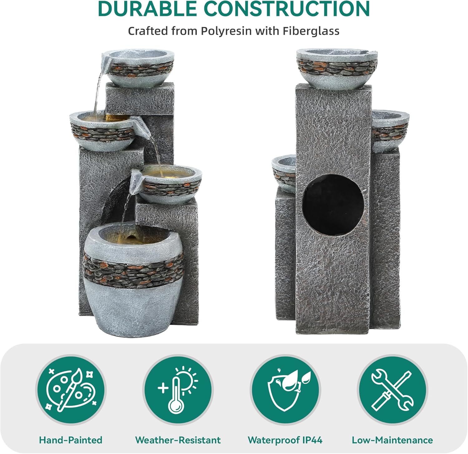 - DURABLE CONSTRUCTION: Crafted from resin and fiberglass, this outside fountain is resistant- to weather, rust, and scratches. Designed for long-lasting beauty with minimal upkeep, it makes a stylish and reliable addition to your outdoor décor all year round.