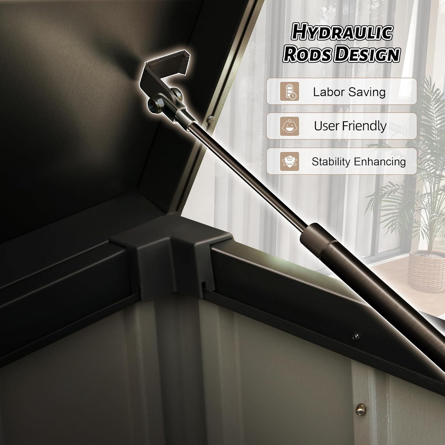 - USER FRIENDLY FEATURES - We' ve designed our patio deck box with hydraulic rods to ensure safe and effortless opening and closing. If you're on the go, you can lock the box for guaranteed security. SHPAI outdoor storage chest with 2 side handles and 4 rolling wheels help you move it effortlessly