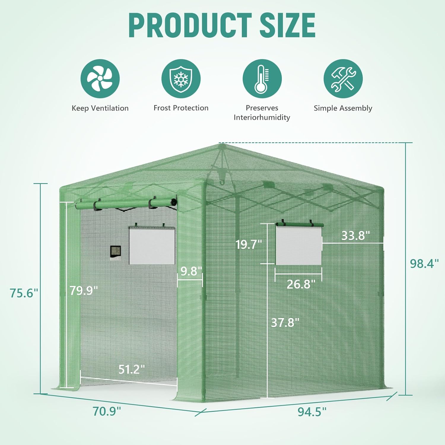 - 【walk in pop up greenhouse】The spacious walk-in pop-up greenhouse gives you freedom of movement for moving and handling plants. The rolled up side window with a screen provides good ventilation and makes it easier to block birds and observe plants.