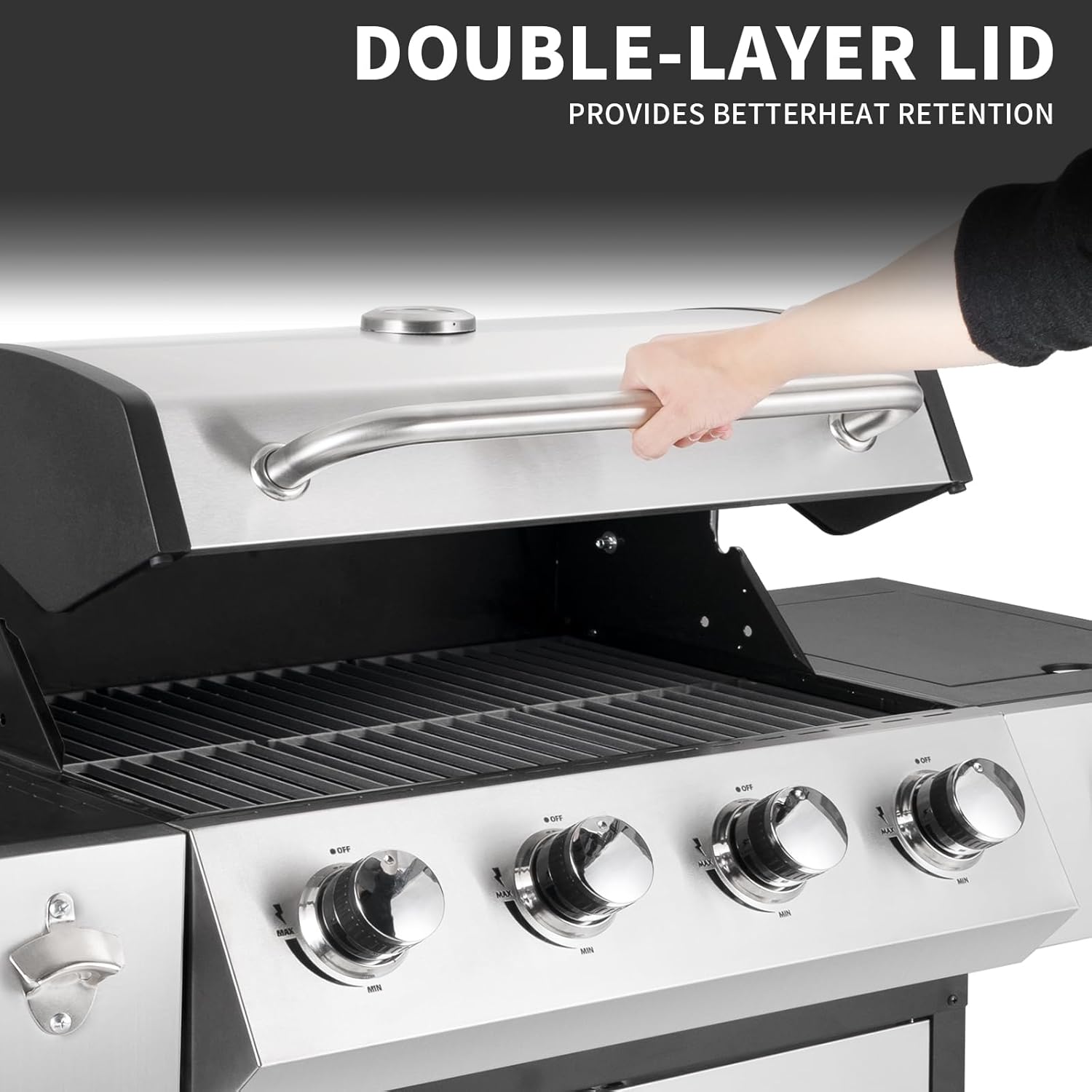 4-Burner Propane Gas BBQ Grill with Side Burner, Barbecue Gas Grill with Enameled Cast Iron Grates for Outdoor Patio Garden Barbecue, 53,000 BTU, Stainless Steel Grill Cover included