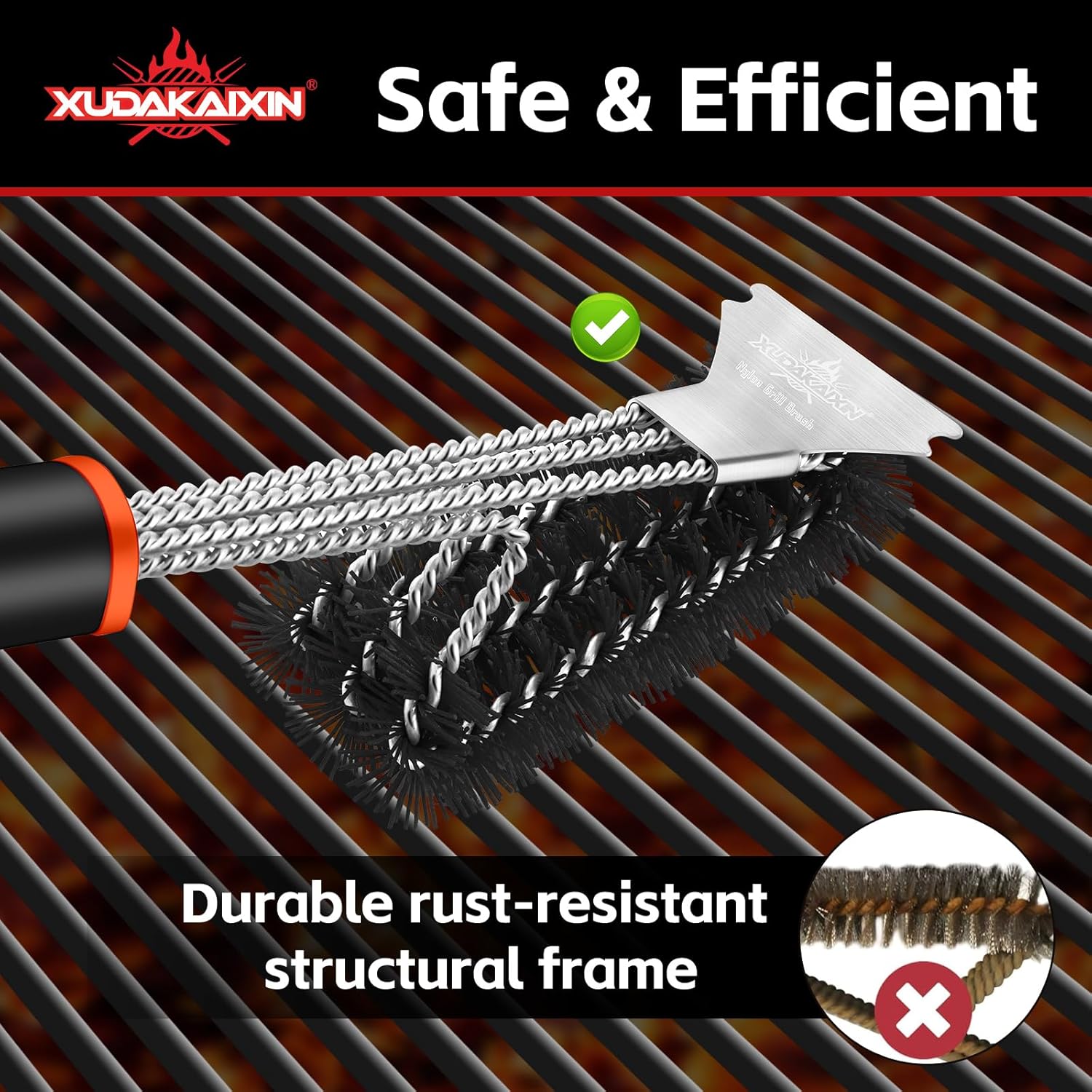 - 【Scraper for Tough Grime】Still battling stubborn residue clinging to your grill? No matter how hard you scrub, traditional brushes just won’t cut it? You’re using the wrong tool! This grill brush features a stainless steel razor-sharp scraper designed to power through even the toughest baked-on grime with minimal effort. Ditch the struggle, save time, and get back to grilling joy—effortless cleaning means more time for fun!