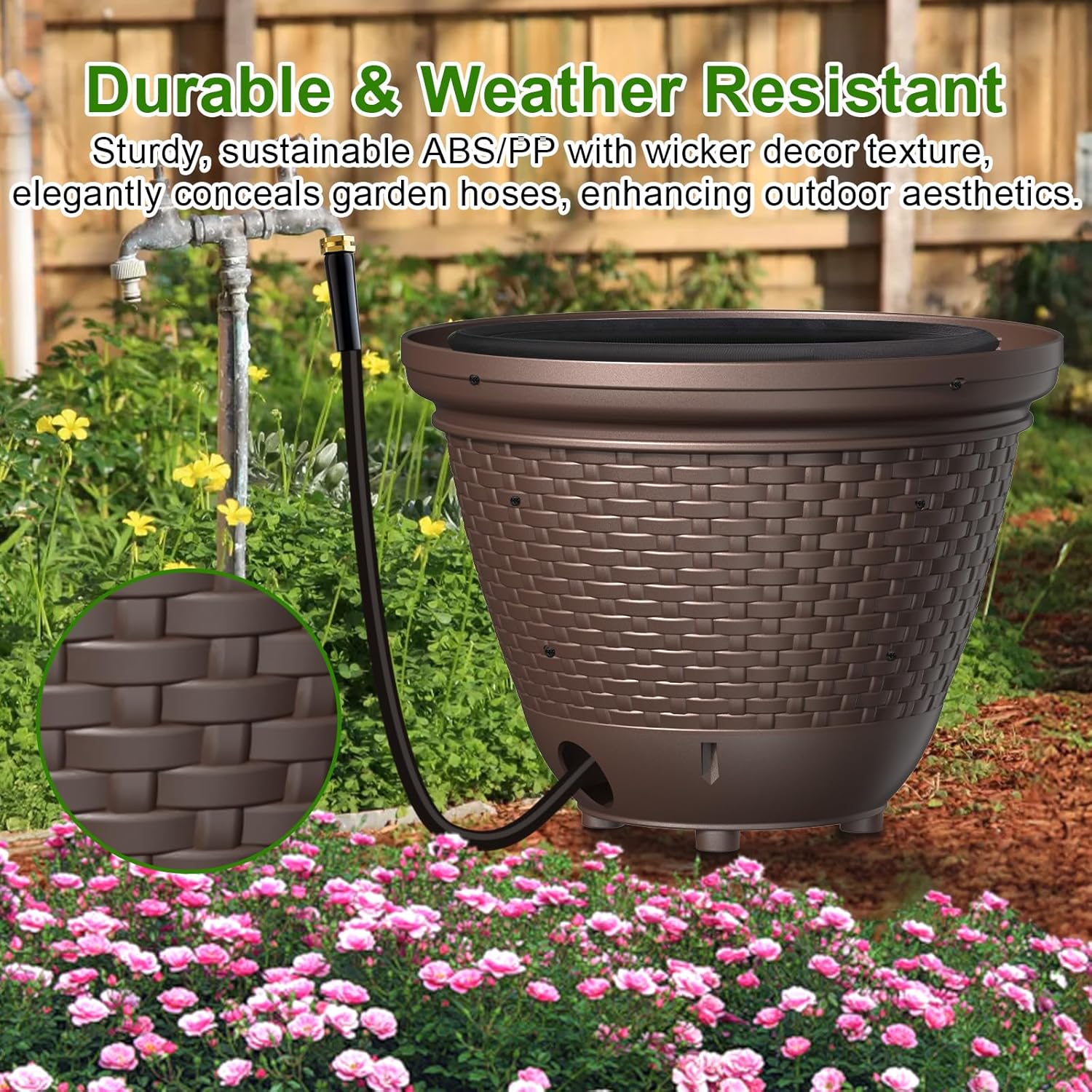 - 【Elegant & Decorative Hose Storage】: The Riokko garden hose holder features a stylish wicker-style design that seamlessly blends into your garden, patio, backyard, or garage. This decorative hose pot not only hides your hose but also enhances outdoor aesthetics with its natural charm. Perfect for storing 100 ft garden hoses while keeping your space tidy