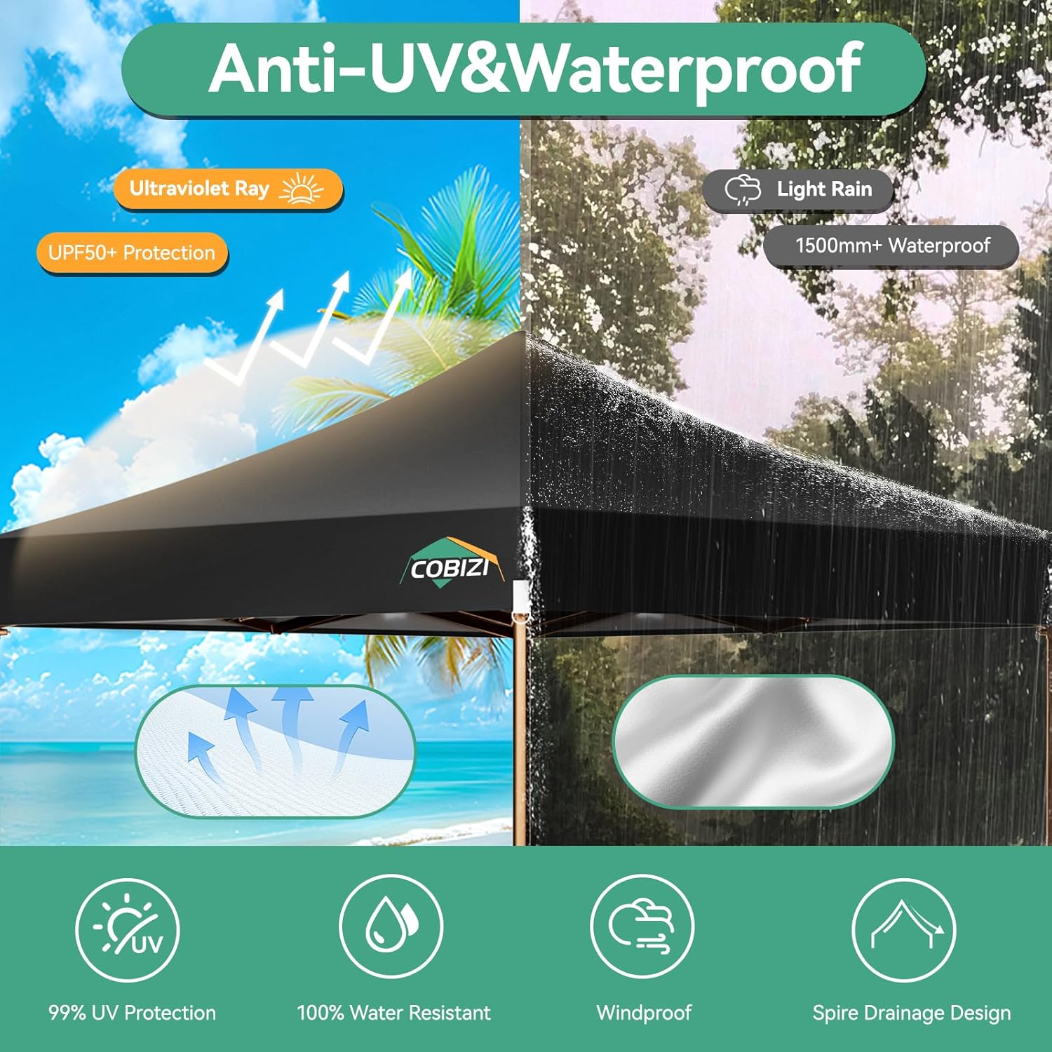 COBIZI 10x15 Pop Up Canopy Tent Heavy Duty Without Sidewall, Commercial Outdoor Easy Pop Up Gazebo for Party Wedding All Weather Waterproof UV 50+ with Roller Bag(Leg Upgraded),Black