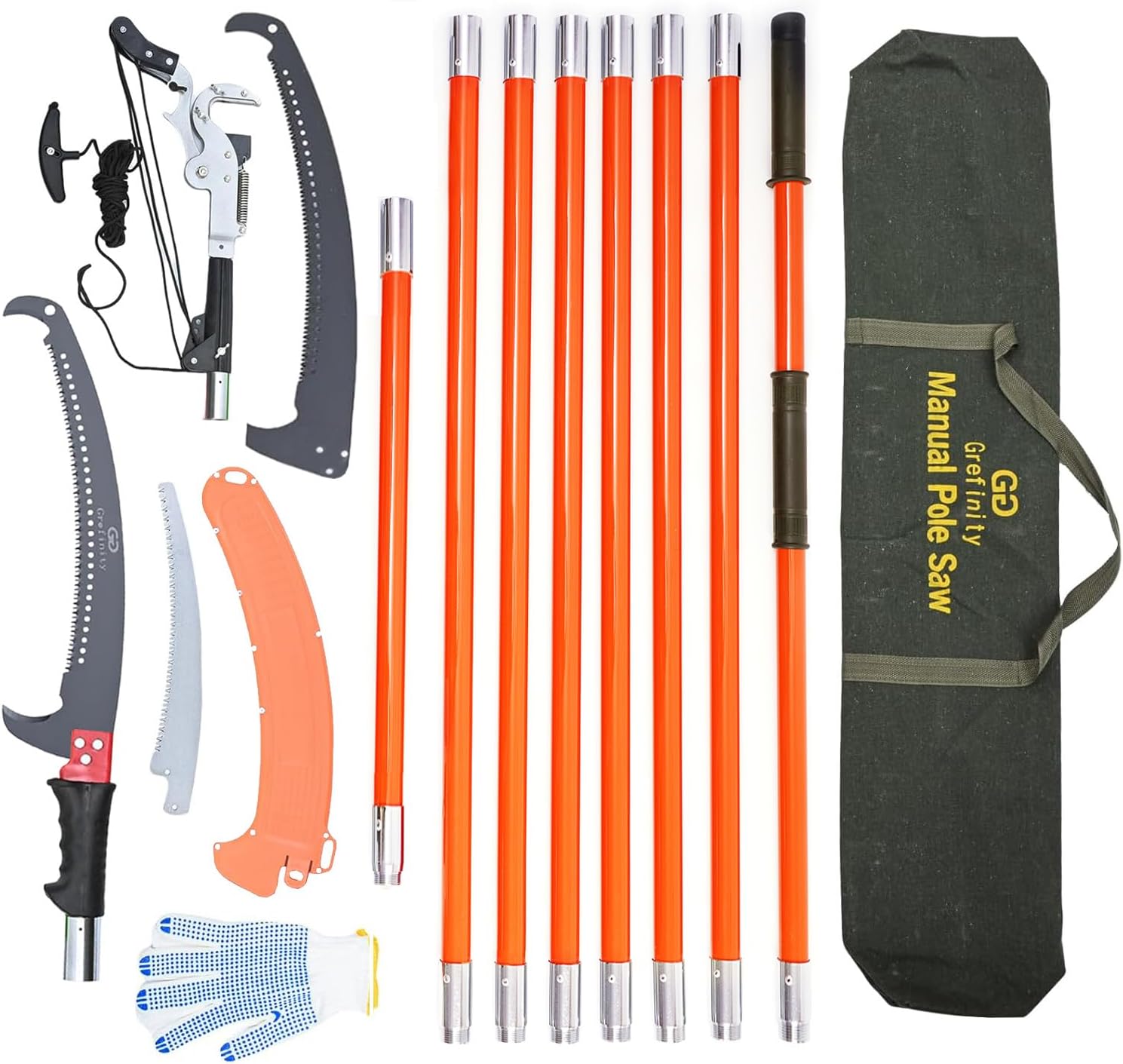 - Safe and Stable Design: The high-quality fiberglass pole is lightweight yet sturdy, providing excellent strength and load-bearing capacity. Each pole section is threaded for a secure, firm connection—no bending or loosening. The 8-section design extends up to 27 feet, enabling safe trimming of tall trees without needing a ladder. Fiberglass also provides electrical insulation, reducing the risk of shock, and a blade cover protects against accidental cuts.