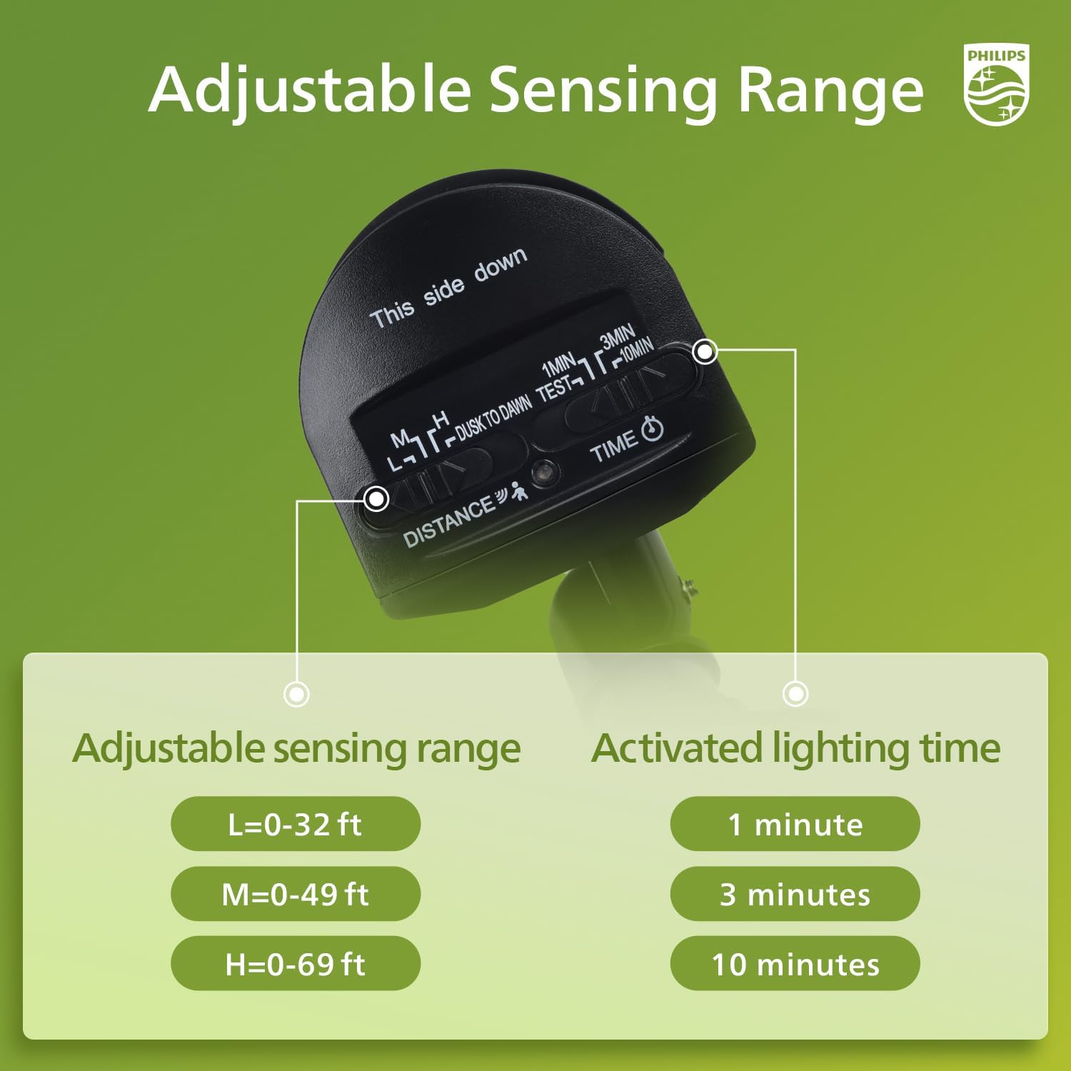 - HIGH-SENSITIVITY MOTION SENSOR - High-sensitivity passive infrared (PIR) motion sensor detects motion up to 69 ft away over a 180Β° angle; you can set light on time for 1, 3, or 10 mins.