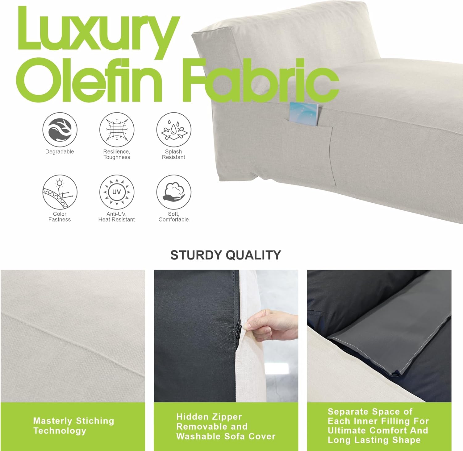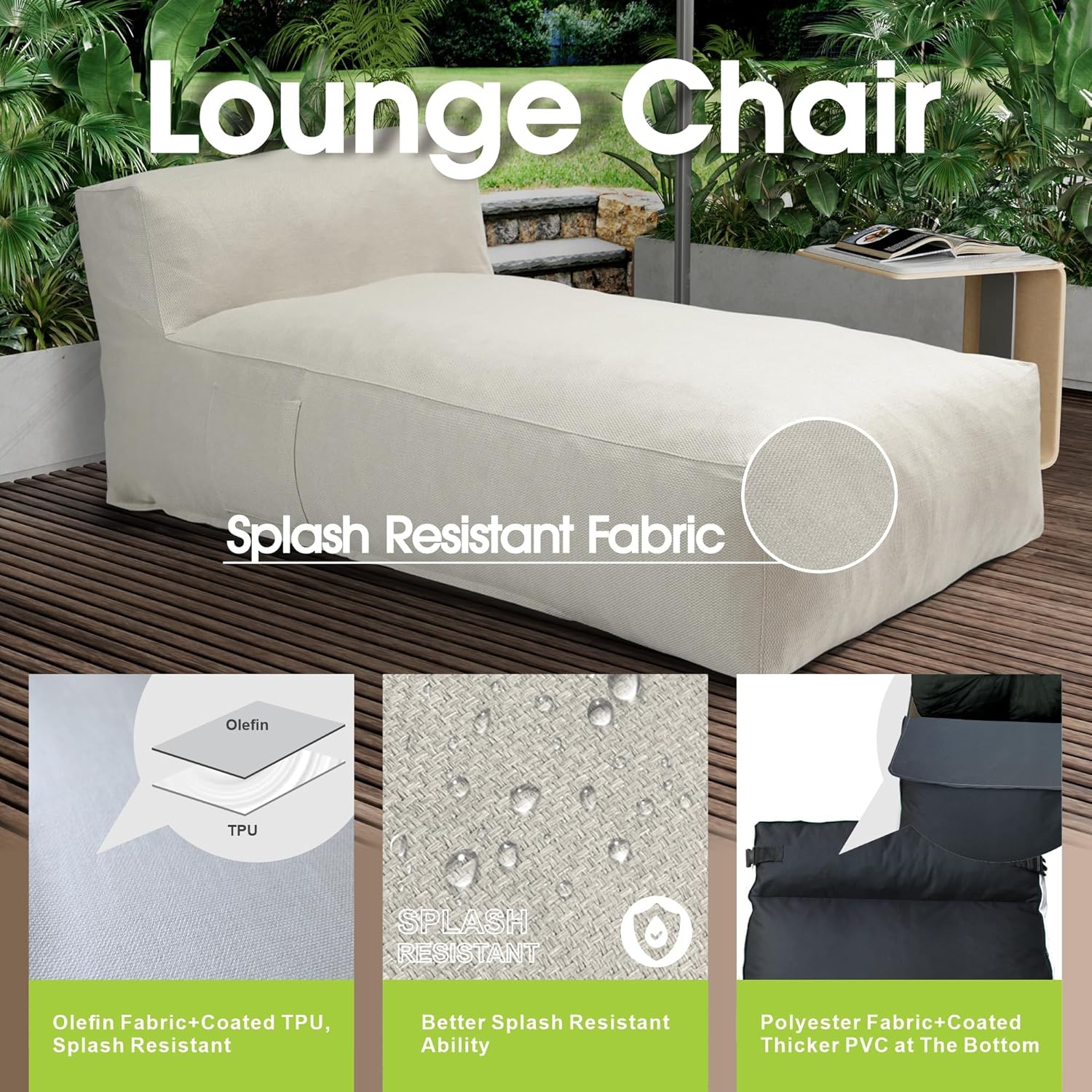 • Premium Olefin Fabric – Water Repellent, UV Resistant, and Durable - Made with high-performance olefin fabric, this lounger resists splashes, fading, and UV rays while remaining breathable and soft. Olefin is known for its color fastness, heat resistance, and eco-friendliness, making it the ideal material for outdoor lounge furniture that looks good and holds up season after season.