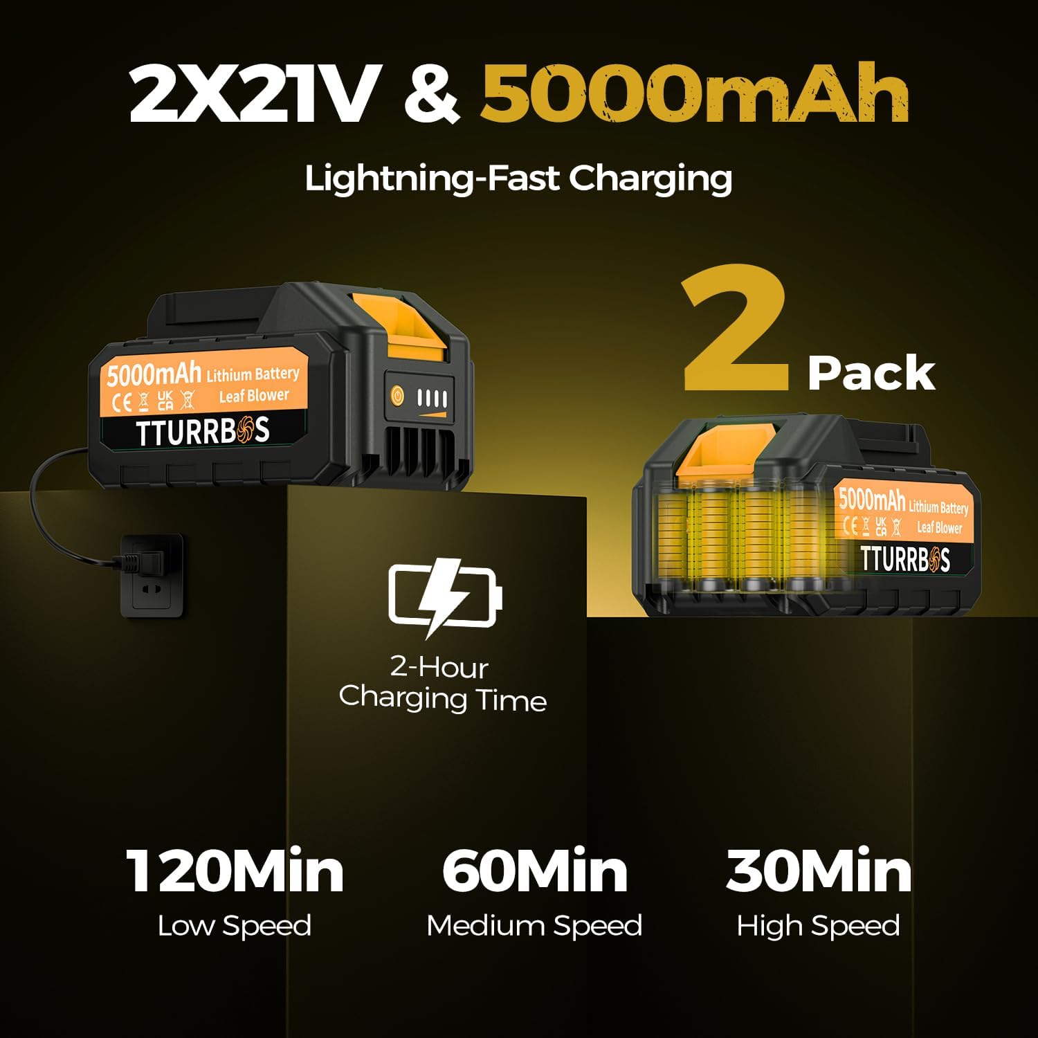 - 【Long-Lasting Power & Fast Charging】Our cordless leaf blower with battery and charger delivers extended runtime and turbo performance. With dual 5.0Ah 21V lithium batteries, it runs for 120 minutes at low speed (30 minutes high speed) and features a 4-stage battery indicator (25%-50%-75%-100%) for real-time tracking. The advanced battery system ensures strong, steady airflow with no power loss, and the included fast charger fully powers your leaf blower in just 2 hours
