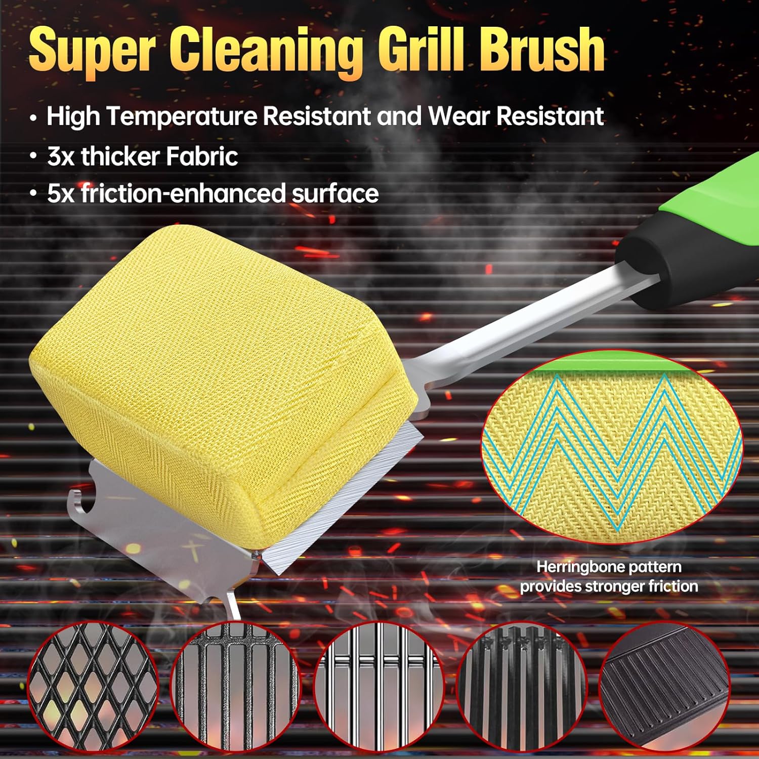- 【Heat Resistance & Stronger Friction】The BBQ grill cleaner brush head fabric is made of high-quality Aramid for excellent abrasion resistance and superb heat resistance.The unique design of the Herringbone pattern provides stronger friction.This is the ideal barbecue brush tool designed to remove stubborn, sticky grill residue, ensuring efficient and thorough cleaning every time
