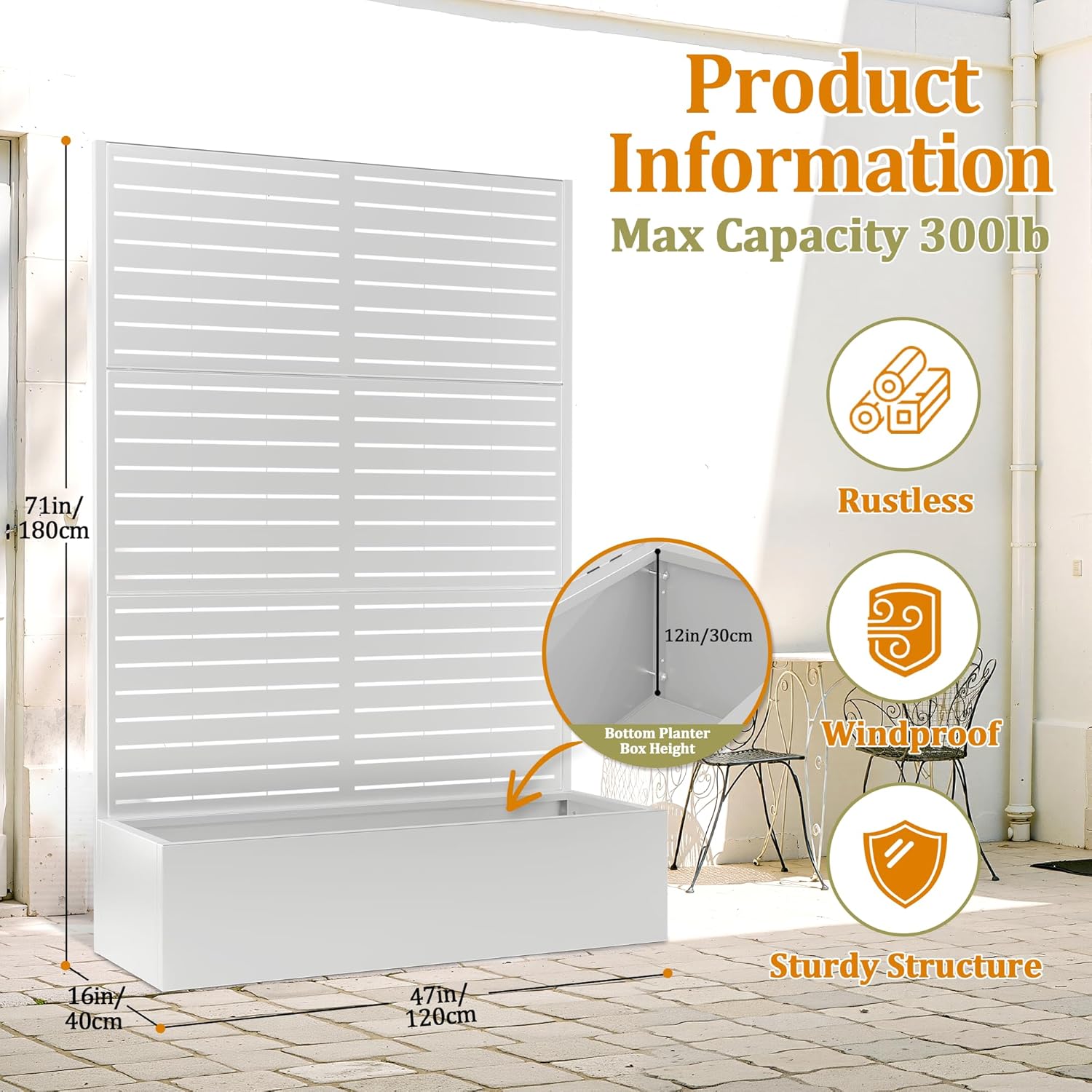 - 💧【Spacious and Efficient Planting Area】Enjoy abundant space in this metal planter box with trellis, ideal for vegetables, herbs, and climbing flowers. Drainage holes prevent waterlogging, making it a perfect garden raised bed for climbing plants. With its vertical structure, this metal planter with privacy screen allows you to grow upward, saving ground space. Plus, this metal planter box with trellis is great for small patios or urban gardens.