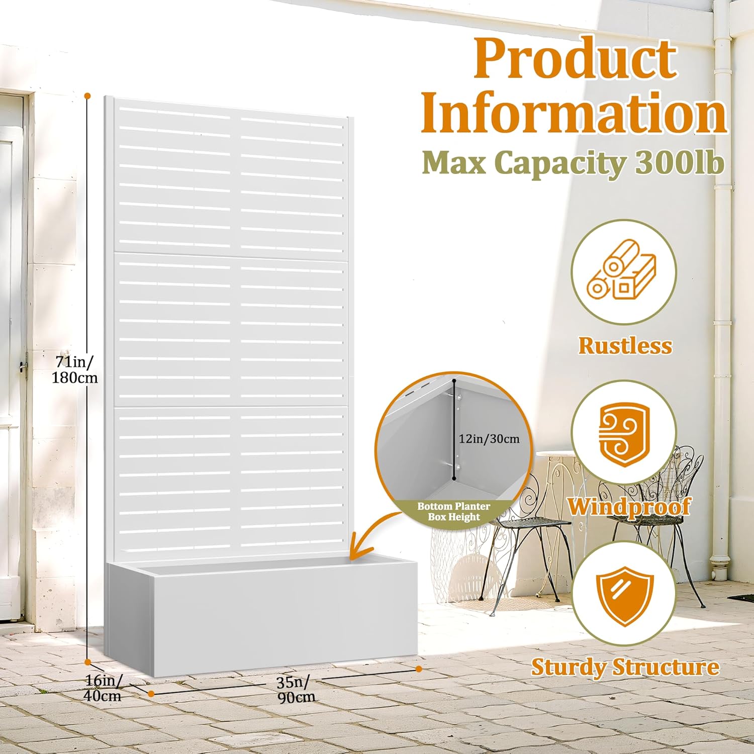 - 💧【Spacious and Efficient Planting Area】Enjoy abundant space in this metal planter box with trellis, ideal for vegetables, herbs, and climbing flowers. Drainage holes prevent waterlogging, making it a perfect garden raised bed for climbing plants. With its vertical structure, this metal planter with privacy screen allows you to grow upward, saving ground space. Plus, this metal planter box with trellis is great for small patios or urban gardens.
