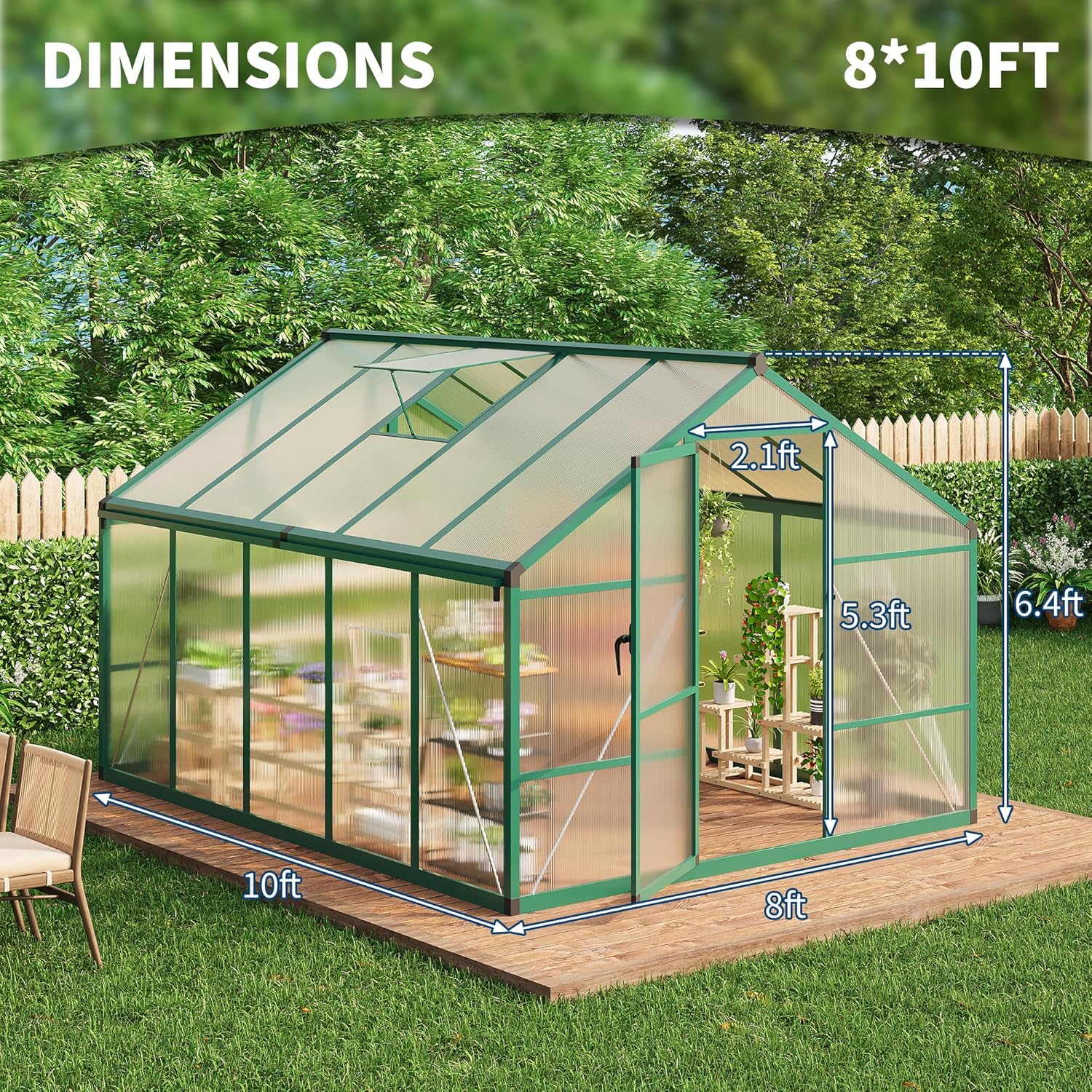 8 x 10 FT Greenhouse, Greenhouses for Outside, Polycarbonate Greenhouse with Aluminum Frame, Lockable Door and Ajustable Roof Vent for Backyard, Green Houses for Outside Garden Backyard, Patio