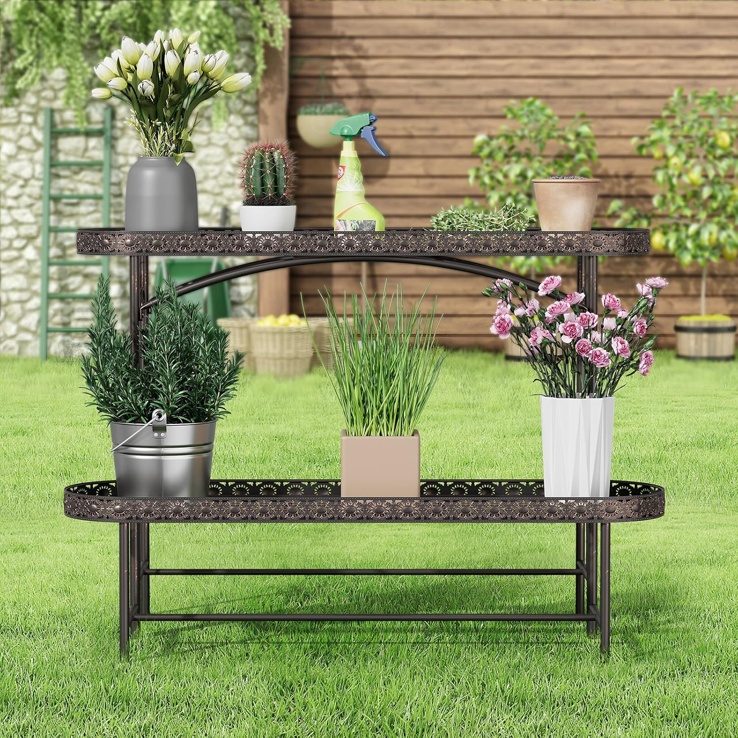 - Premium Material Construction: This 2-tier plant shelf is made from specially processed metal, ensuring exceptional durability and a long lifespan. Its weather-resistant feature makes it ideal for both indoor and outdoor use, withstanding harsh elements while keeping your plants securely supported throughout the seasons.