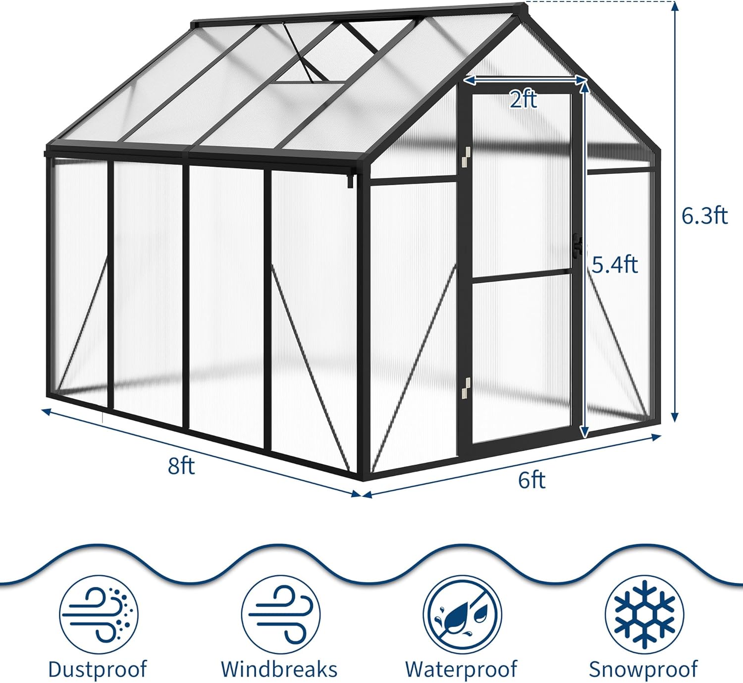 6 x 8 FT Greenhouse, Greenhouses for Outside, Polycarbonate Greenhouse with Aluminum Frame, Lockable Door and Ajustable Roof Vent for Backyard, Green Houses for Outside Garden Backyard, Patio