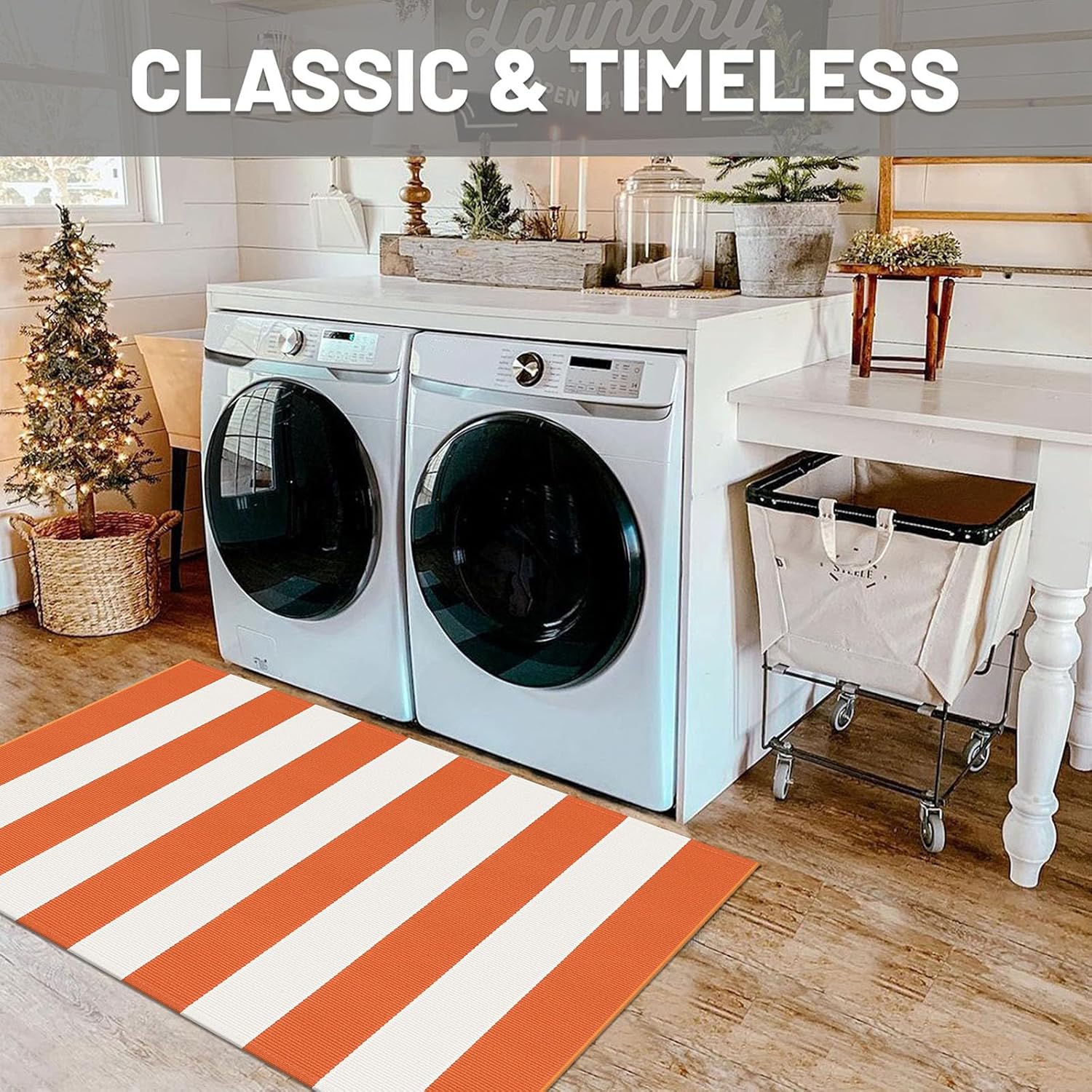 - Easy to Clean: This orange and white striped rug is simple to maintain with machine wash or vacuuming to remove dirt. The rug is sturdy and can be tumble dried on low. Keep your door rug fresh and clean with minimal effort. NOTE: Cotton rugs normally shrink slightly after washing