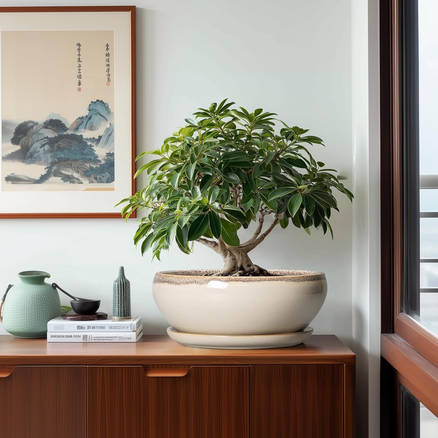 - Plant Pots with Drainage Hole and Ceramic Saucer: The bottom of the bonsai tree pots has drainage hole and a matching ceramic plant saucer to collect excess drainage and soil overflow, keeping plant root cared and your indoor tidy