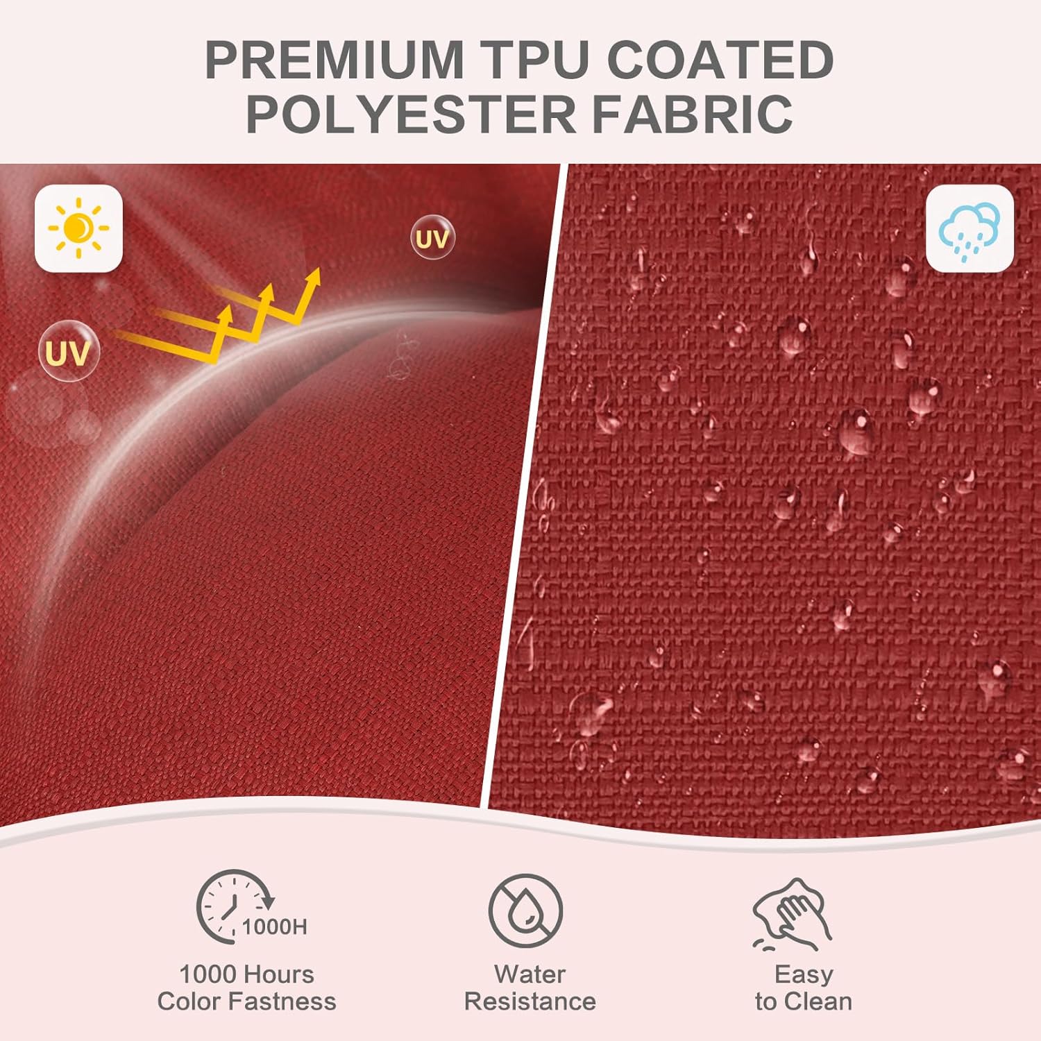 - Fabric Details: Crafted from premium polyester, this cushion features UV-resistant, fade-resistant properties and can withstand over 1,000 hours of direct sunlight exposure without color fading