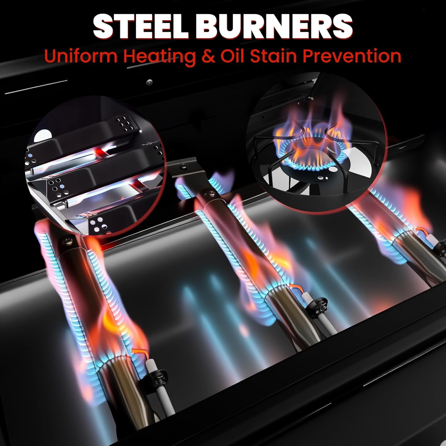 - SERIOUS BTU POWER, SMART ENERGY USE: 36,000 BTU total output (3 x 8,000 BTU vertical tube burners + 12,000 BTU circular side burner) for masterful heat zones (BTU measures energy, not heat—efficiency meets power)
