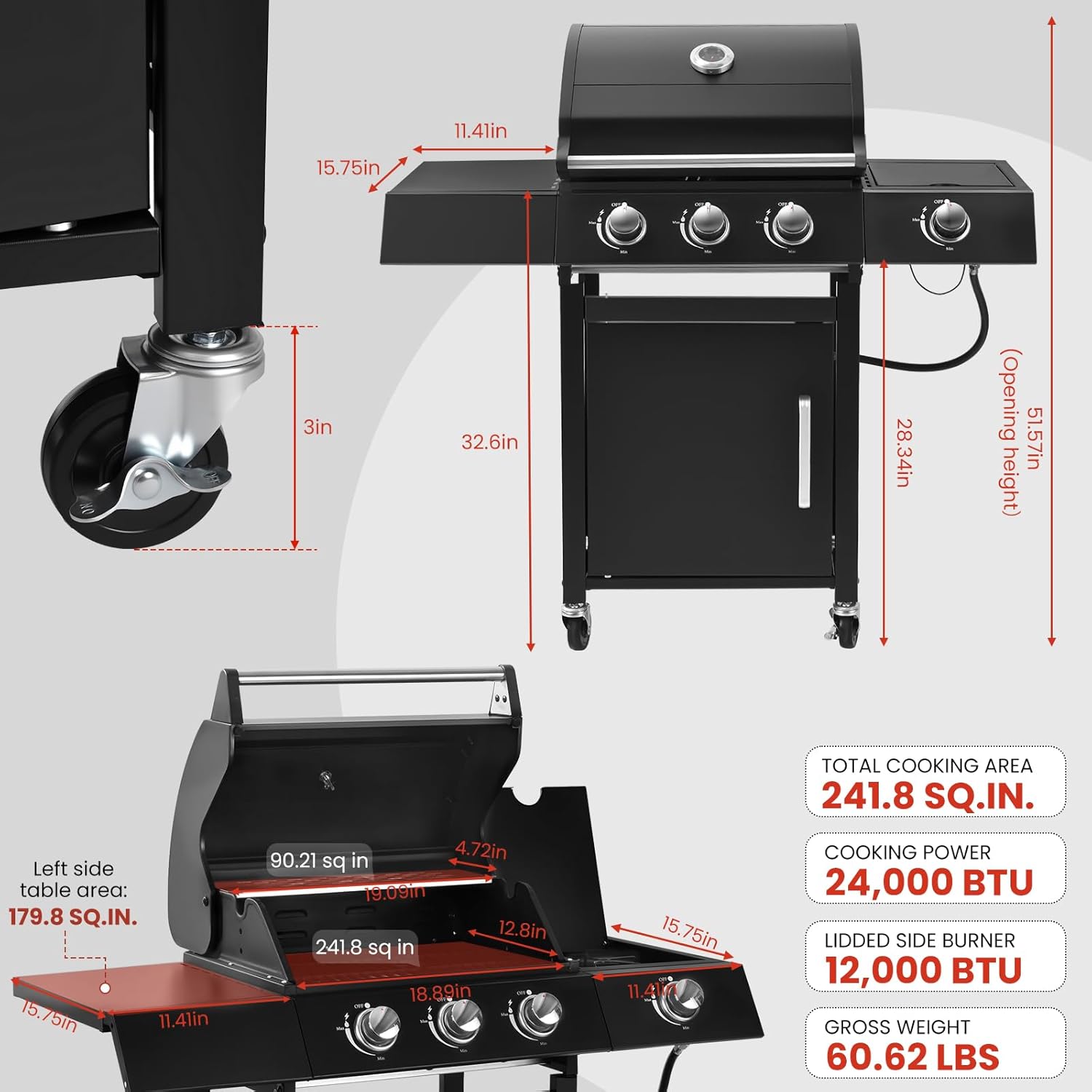 Q042-3-Burner w/Side Burner Gas Grill with 241 SQ.IN. Outdoor Grill with 36,000 BTU,Propane Grills with Top Cover Lid,Grills Outdoor Cooking for Patios,Balcony,Camping,Garden