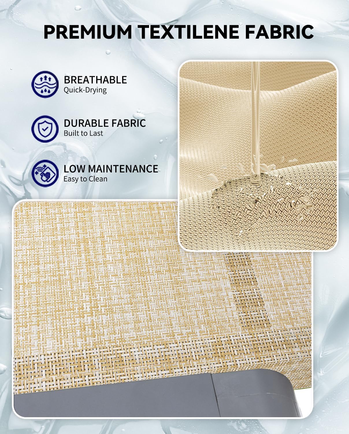 • 【ALL-SEASON COMFORT】Crafted from premium Textilene fabric, our outdoor chaise lounge is weather-resistant and quick-drying, perfect for all-season use. Its flexible and breathable design keeps you cool on hot days, while the easy-to-clean surface requires only a quick wipe with a damp cloth for effortless maintenance and lasting comfort