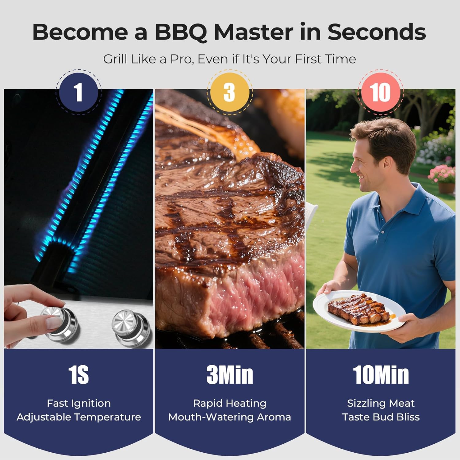 - Last-Long BBQ Grill: Experience the ultimate in outdoor grilling with our Premium Full Stainless Steel Grill. The BBQ grill (except the storage frame and door, which are made of 201 stainless steel) is crafted from food-grade 304 stainless steel β widely recognized as the industry's gold standard for corrosion resistance. Unlike inferior grills that use cheap 430 stainless steel or galvanized metals, our heavy-duty gas grill delivers a lifespan 1.5 to 7.5 times longer.