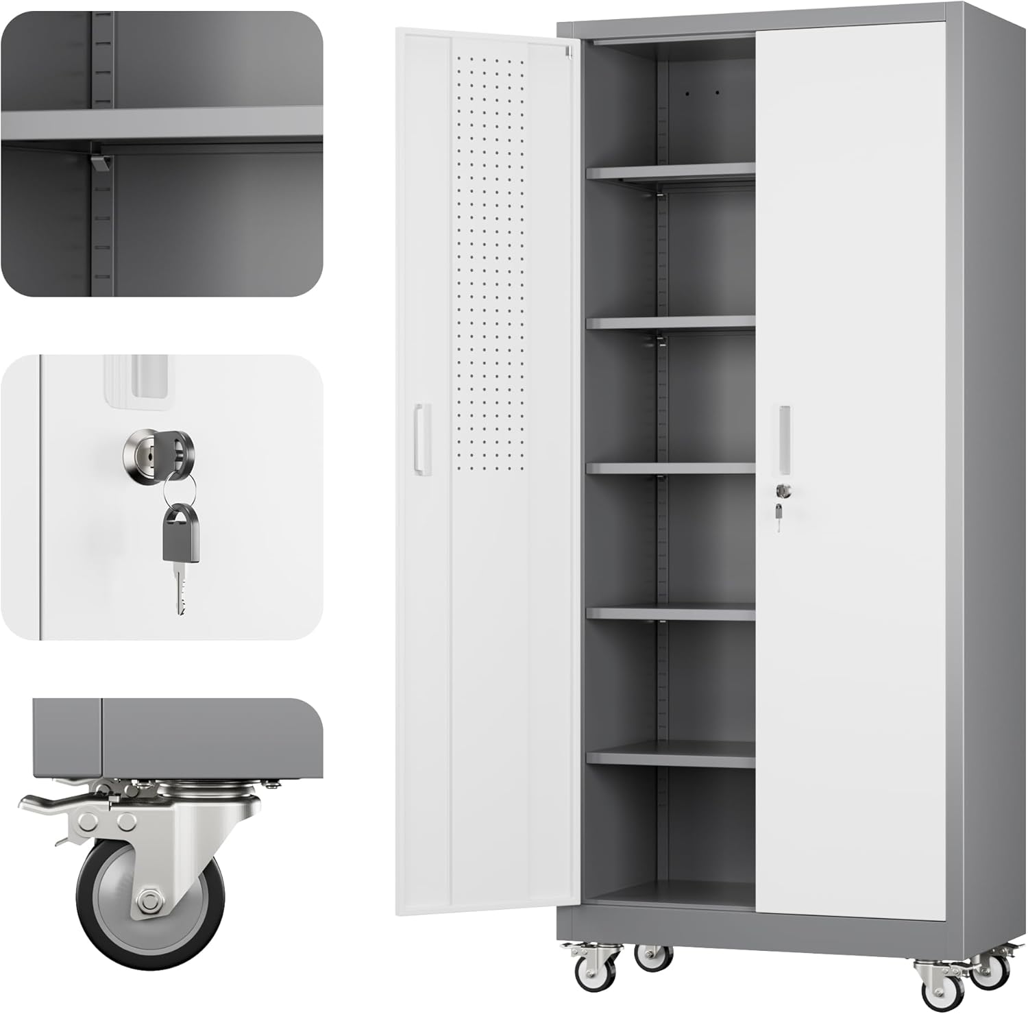 Metal Garage Storage Cabinet with Wheels & Pegboard, Lockable Metal Storage Cabinets with 2 Doors&5 Adjustable Shelves for Garage&Home,Assembly Required,Gray White 71''H x32''W x16''D