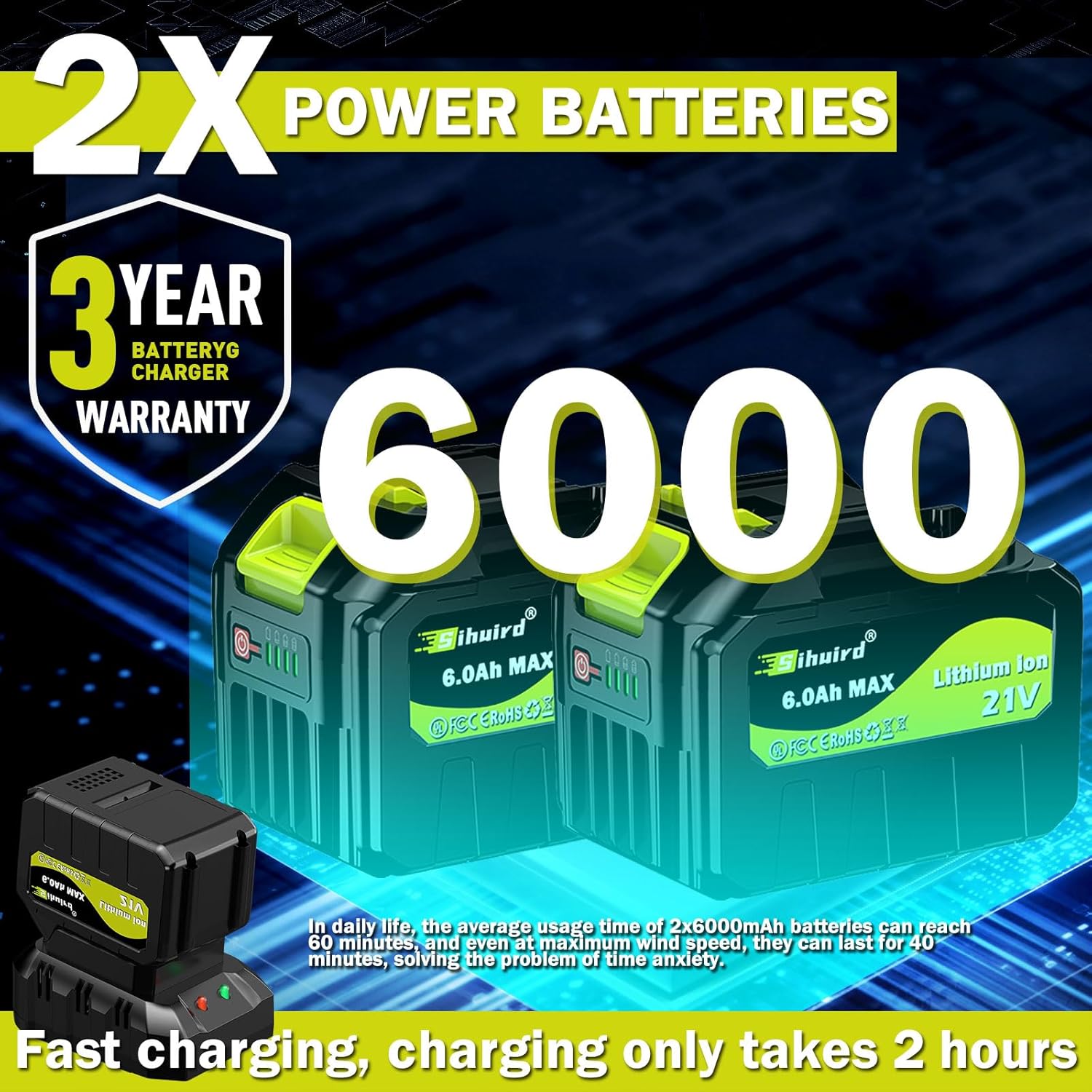 - 【Upgrade to 2x6.0Ah Batteries】:Sihuird Cordless Leaf Blower Equipped with 2x6.0Ah batteries and a fast charger, In daily life, the average usage time of 2x6000mAh batteries can reach 60 minutes, and even at maximum wind speed, they can last for 40 minutes, solving the problem of time anxiety.