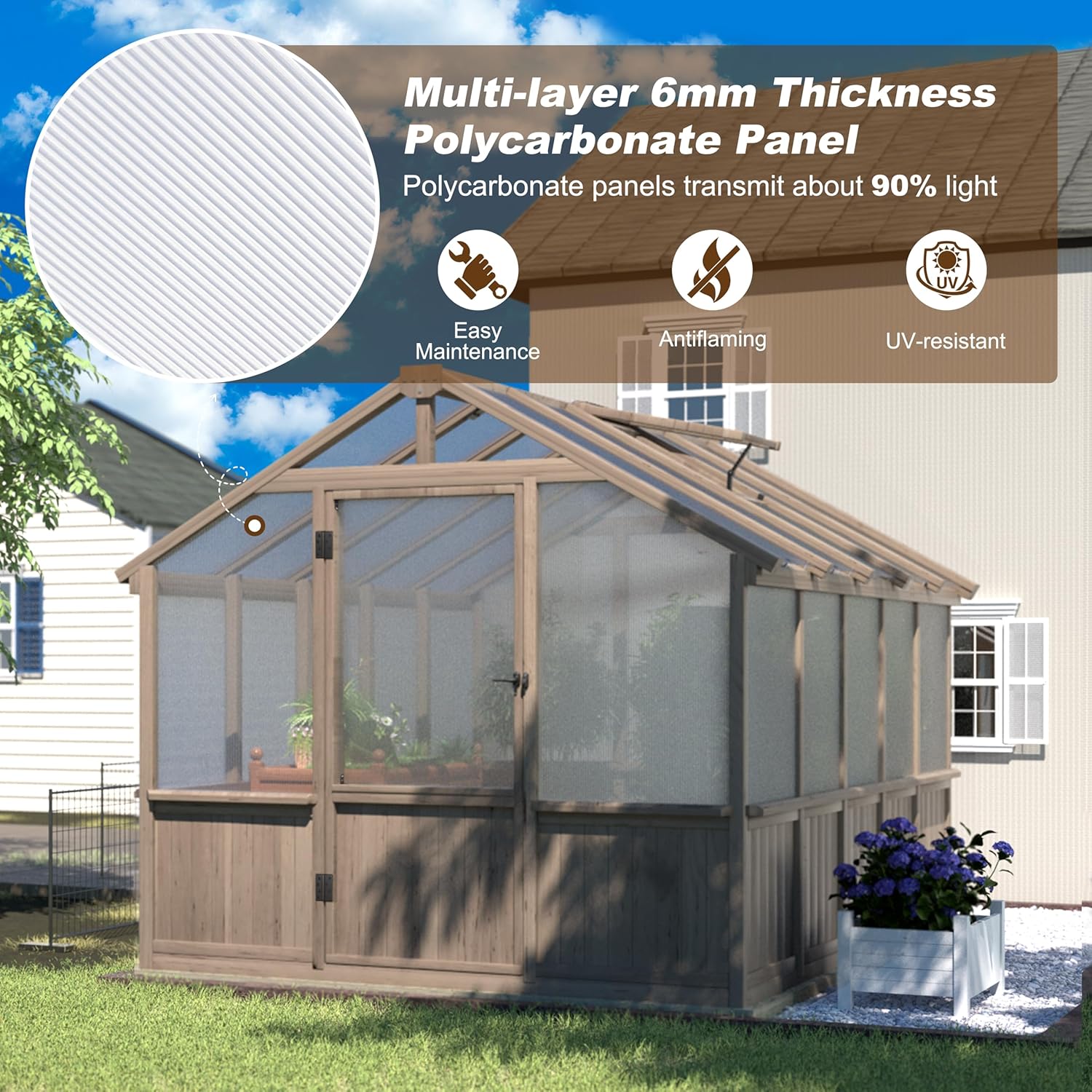 8x10 FT Greenhouse Kit with 6MM Thick Polycarbonate Panel for Outdoor, Wooden Walk-in Green House with Adjustable Roof Vent and Lockable Door, Backyard, Garden, Light Mocha Brown