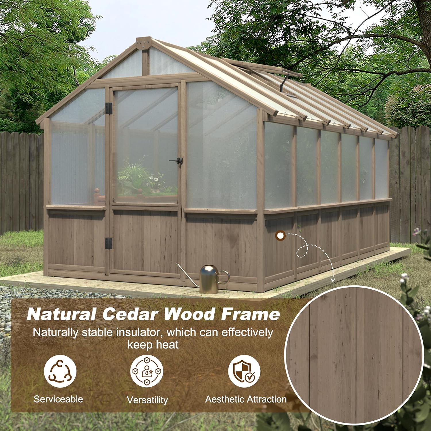 8x12 FT Greenhouse Kit with 6MM Thick Polycarbonate Panel for Outdoor, Wooden Walk-in Green House with Adjustable Roof Vent and Lockable Door, Backyard, Garden, Light Mocha Brown