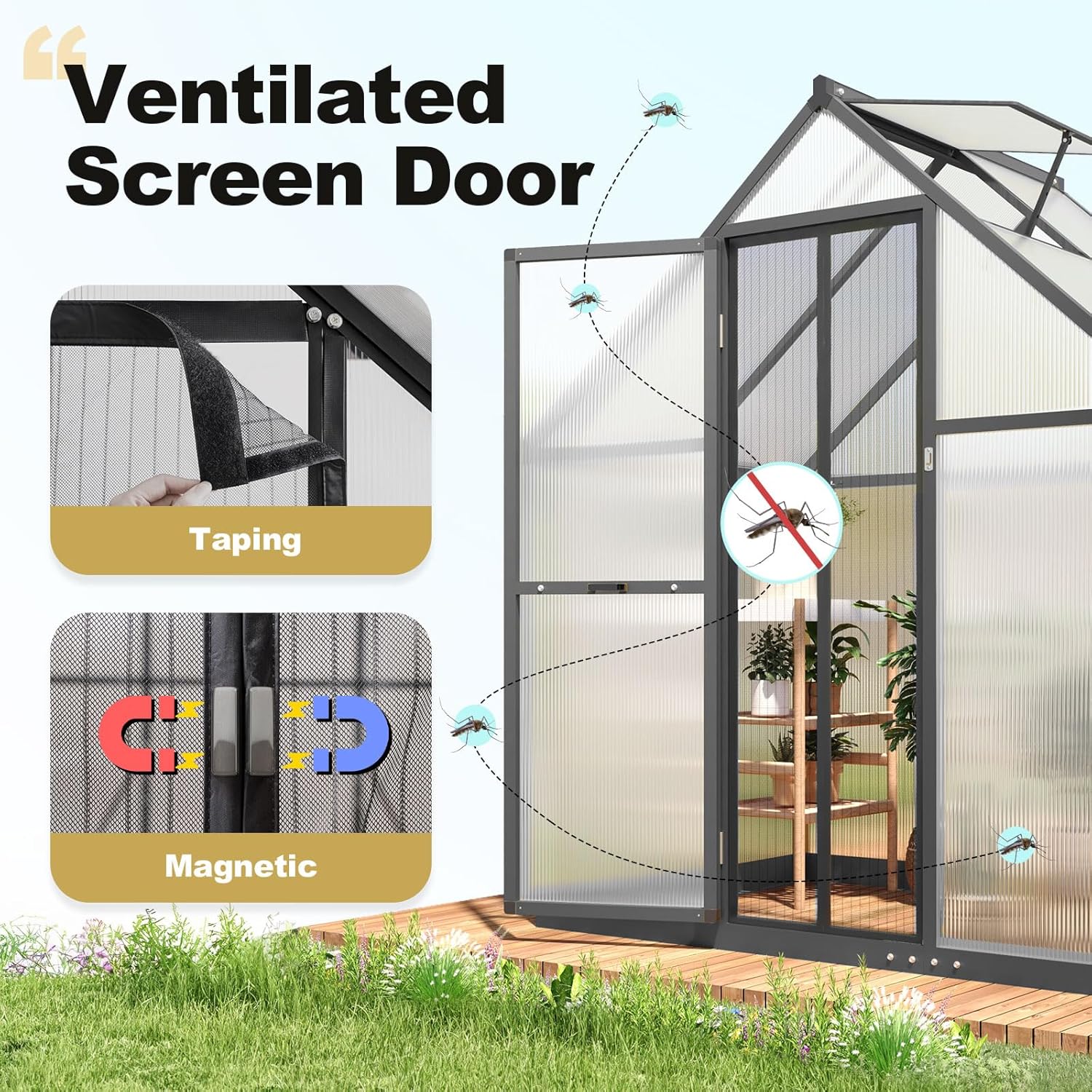 KING BIRD Greenhouse for Outdoors, 4x6 FT Polycarbonate Walk-in Green House, Quick-Setup Aluminum Frame UV Resistant Panel for Outside Garden Backyard W/ Lockable Screen Door, Vent, Black