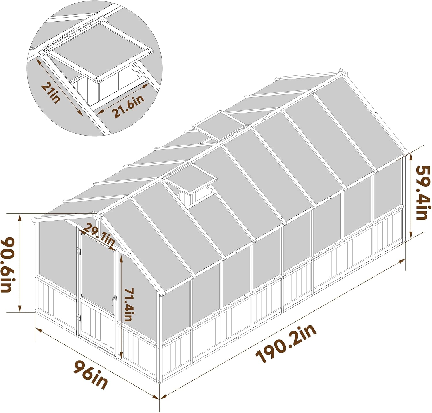 8x16 FT Greenhouse for Outdoor, 6MM Thick Polycarbonate Panel Wooden Walk-in Green House with Adjustable Roof Vents and Lockable Door, Backyard Garden, Light Mocha Brown