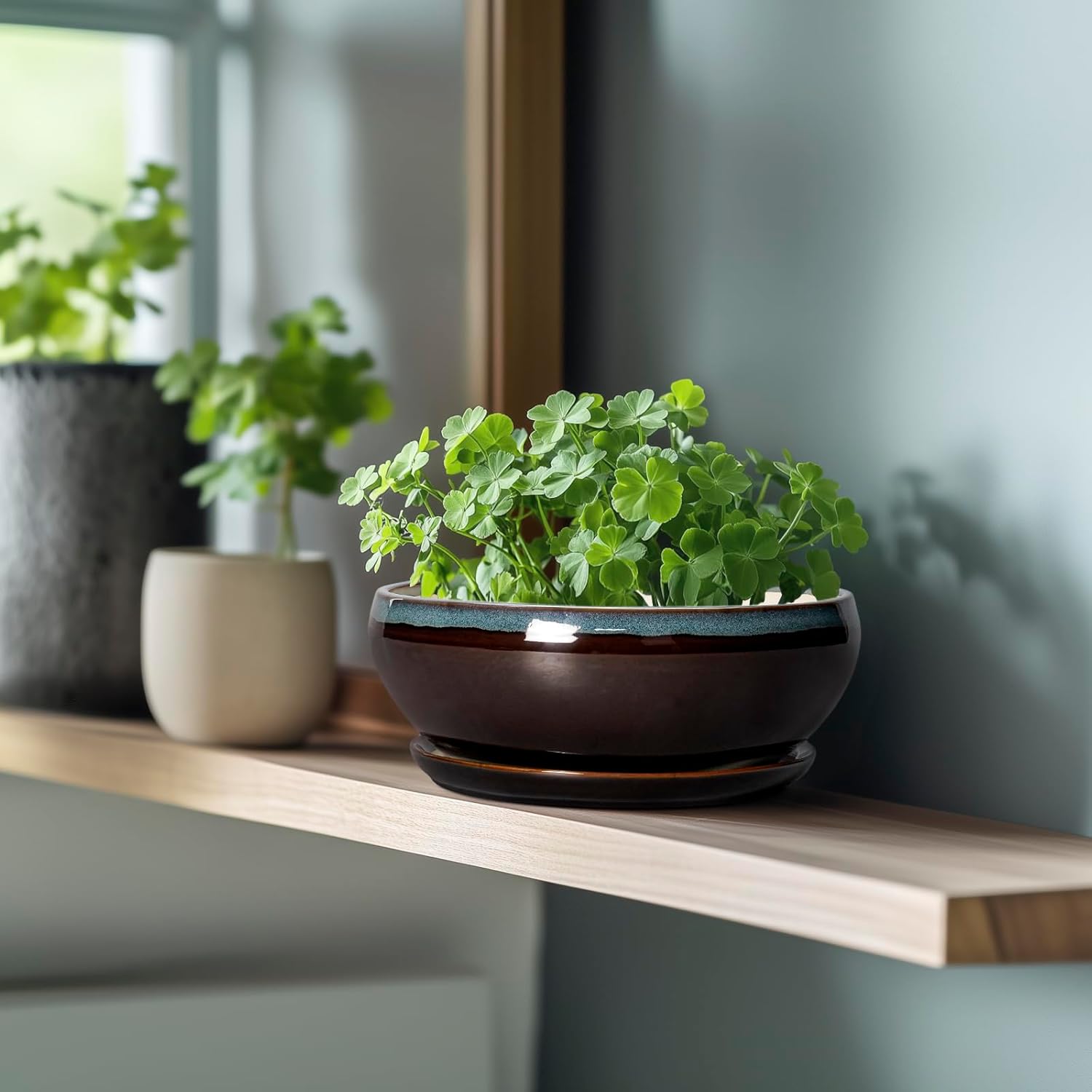 SQOWL Succulent Planters 8 Inch - Ceramic Bonsai Pots with Drainage Hole and Ceramic Saucer, Round Shallow Planter for Indoor Plant, Bowl Planter Outdoor, Desk Decor, Gift for Plant Lover, Blue-Brown