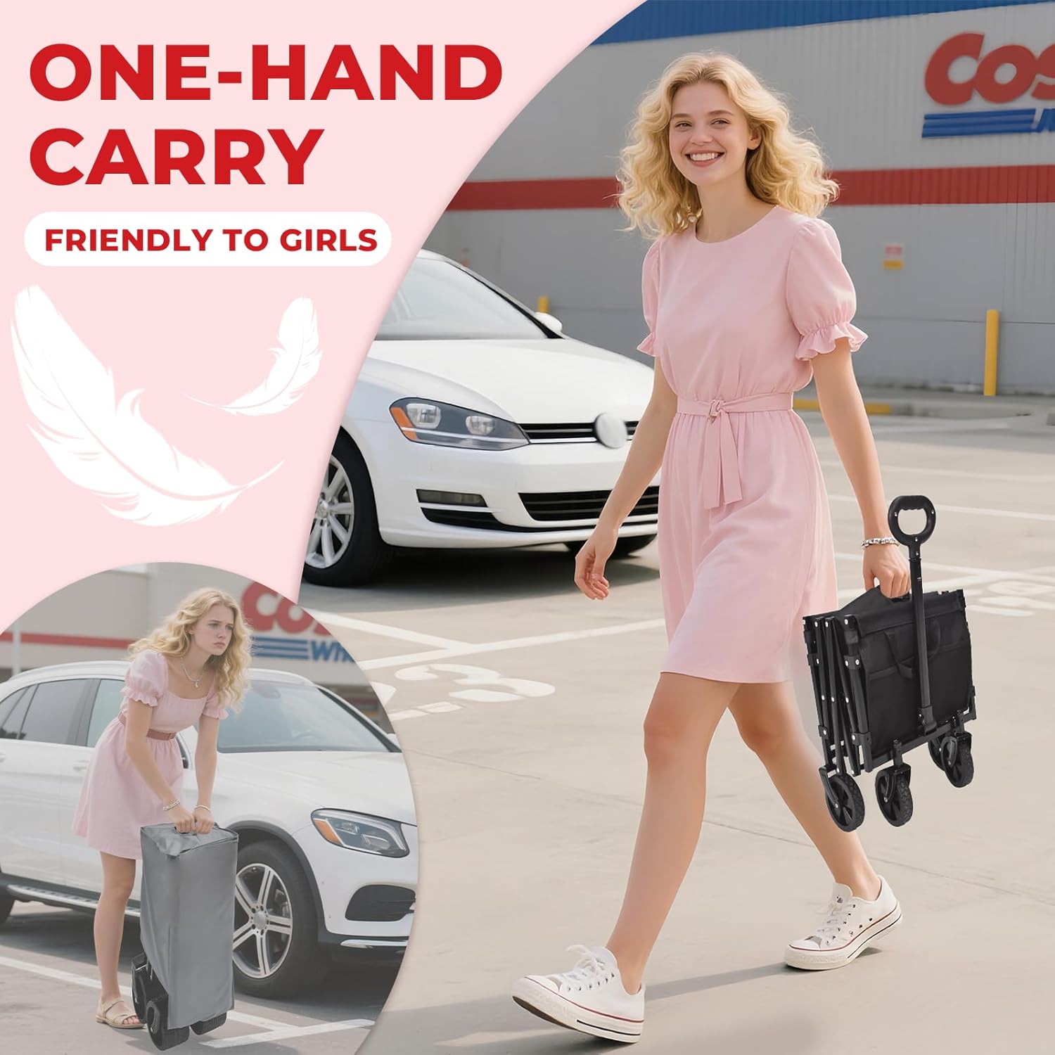 - Ergonomic Telescopic Handle With Easy Grip:Adjustable pull handle offers a secure, comfortable grip to reduce wrist strain. Push or pull this folding utility wagon easily—even when fully loaded for groceries, beach days, or camping trips