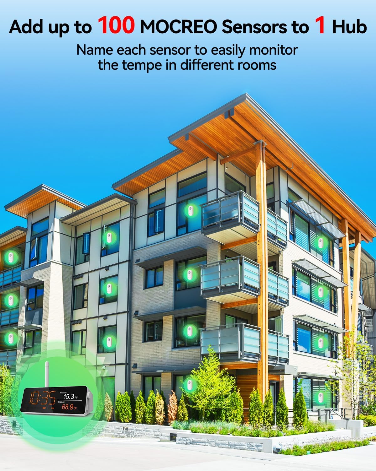 - 24/7 Remote Monitoring: The H5Pro Hub utilizes a long-range wireless protocol to communicate with up to 100 MOCREO sensors from as far as 1640 ft (1/3 mile) away in open areas. Its digital LCD screen acts as a comprehensive dashboard, displaying real-time readings, historical data charts, alerts, the clock, weather, and a calendar. (Connects via Ethernet or 2.4 GHz Wi-Fi).