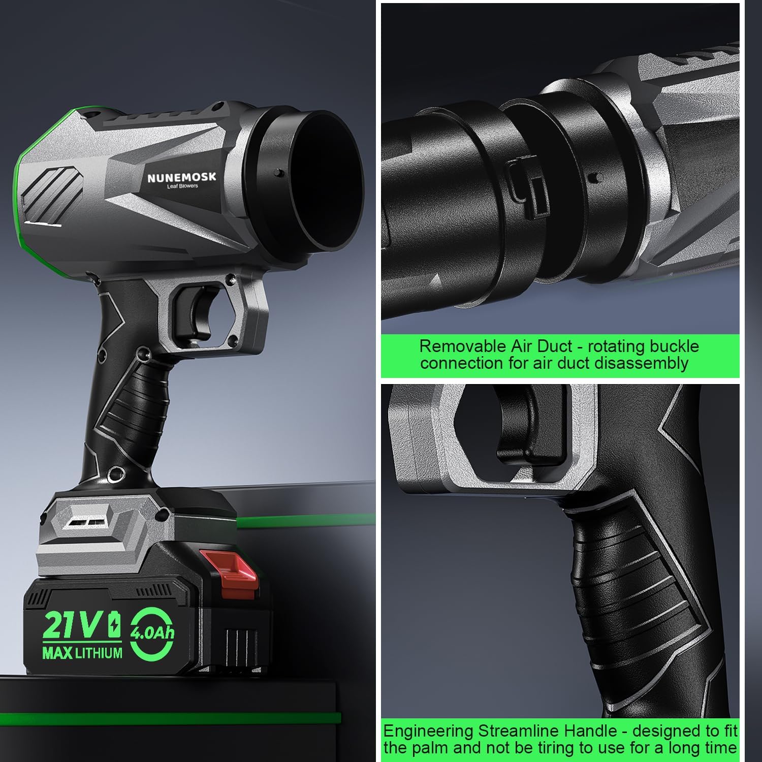 - 【Lightweight Design】The lightweight leaf blowers weighs only 1.4 pounds, plus a 2.6 pound battery, designed for one handed operation. The compact and lightweight design of the leaf blower makes it easy to store and carry, making it perfect for indoor and outdoor cleaning tasks. Nunemosk cordless leaf blower can be assembled in minutes, just install two nozzles and a battery to start the leaf blower. Small leaf blower offers 50 minutes of low-speed mode and 15 minutes of high-speed mode.