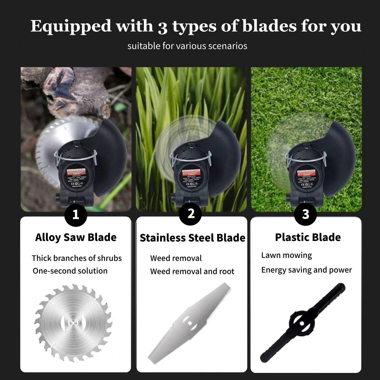 - 【Three Blade Replacements】This weeder is equipped with three blades to meet all your weeding needs: ① Plastic blade: suitable for lawn mowing and light weeds; ② Stainless steel blade: weed cleaning and weed root removal; ③ Alloy saw blade: trim branches and shrubs.