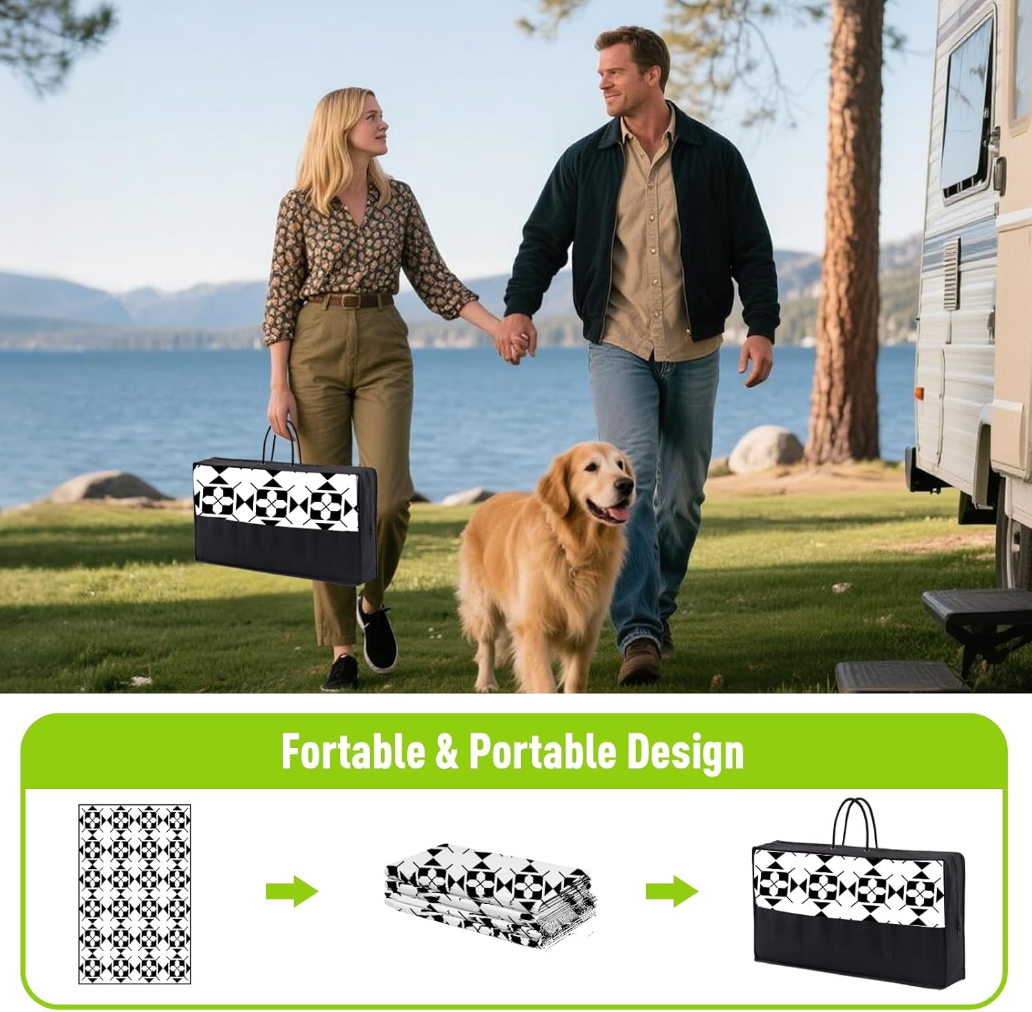 - Portable & Durable: This outdoor plastic rug with seams can be rolled or folded into a compact size and comes with a carrying bag for easy portability. Perfect for outdoor activities, picnics, sunbathing, and RV road trips. The heat-sealed edges prevent wear and tear, withstanding any environment, traffic, or scratches