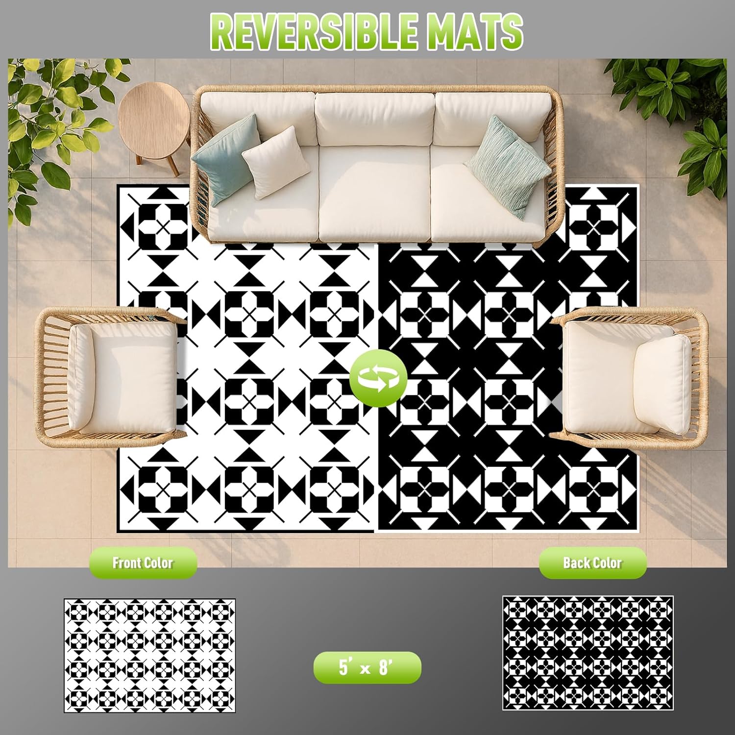 - Reversible Design: This double-sided patio rug features beautiful patterns on both sides, allowing you to quickly flip it over and instantly refresh your patio, porch, backyard, deck, RV campsite, or any outdoor space. A simple way to transform your style effortlessly