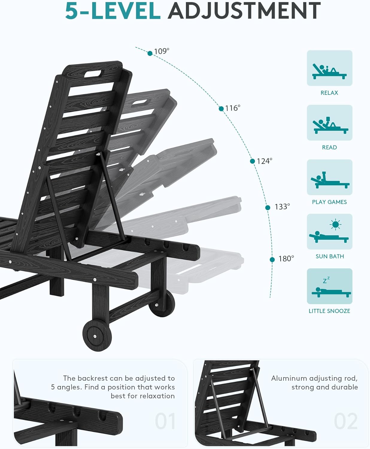 • Rolling Wheels & Handles: This patio chaise lounge comes with convenient rolling wheels and handles, pull on the handle to move it easily to follow the sun or find shade. Enjoy the sun and warm weather on this adjustable chaise lounge, our hdpe lounge chair is perfect for poolside, patio, garden, beach, or deck