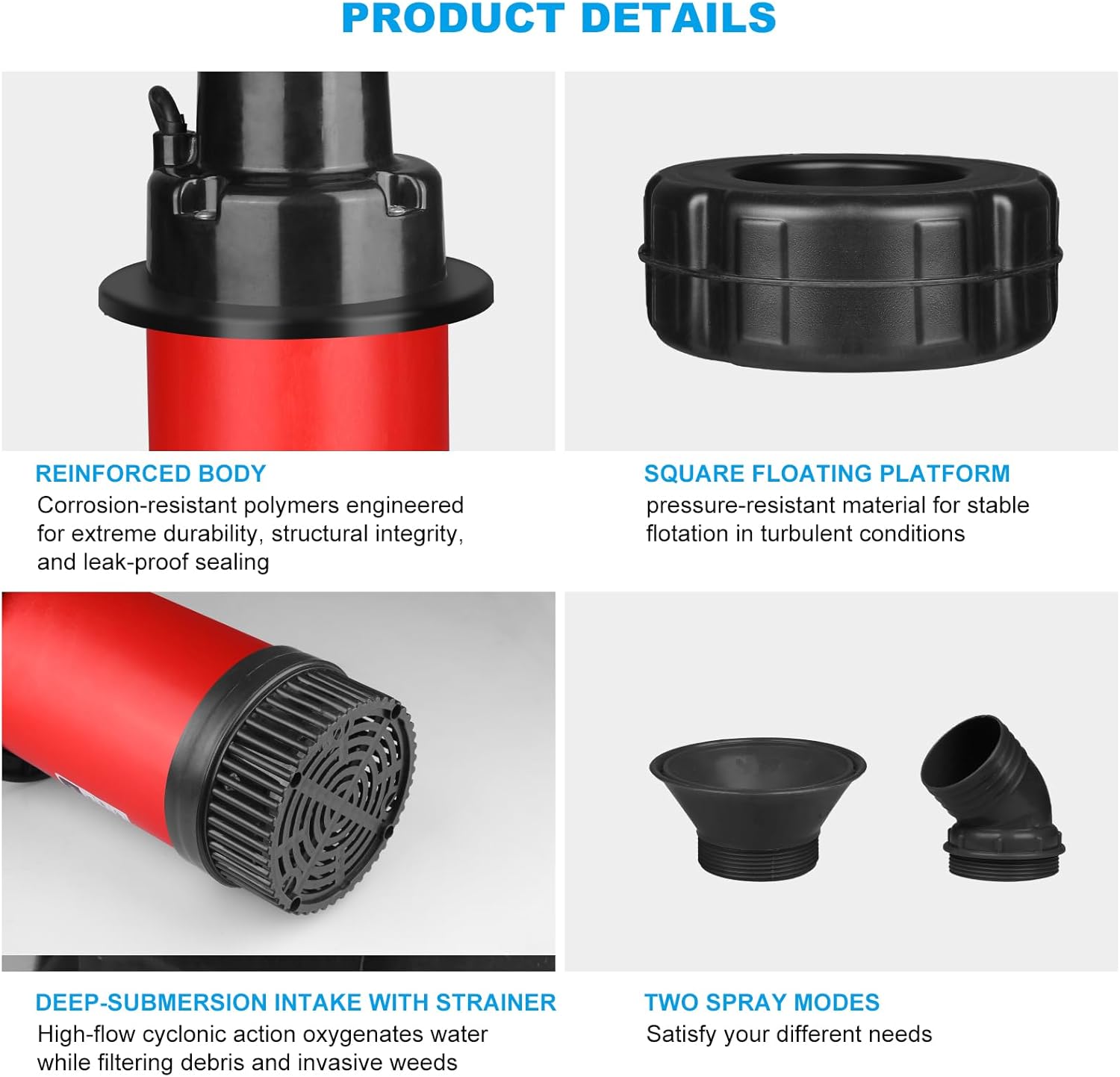 - 【Sturdy & Efficient Construction】Designed for large ponds, our pond fountain aerator features a housing and a corrosion-resistant all-copper motor. The thicker cable enhances safety and power transmission, while the filtered intake prevents debris and weeds, ensuring smooth water flow and pump protection.