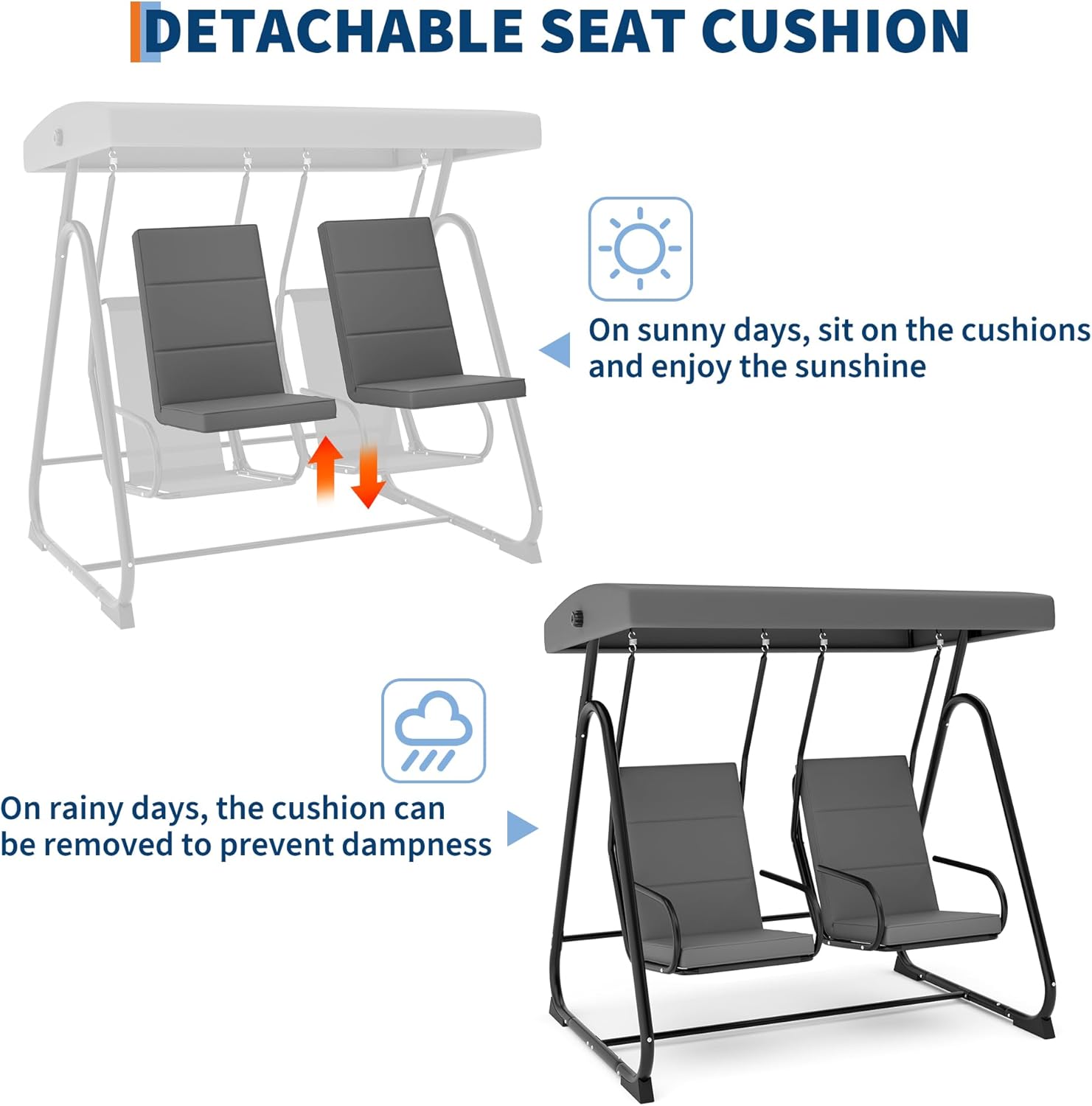 - Stylish Outdoor Design: With a neutral grey finish, this swing complements any backyard, garden, deck, or patio, adding both comfort and elegance to your outdoor space.