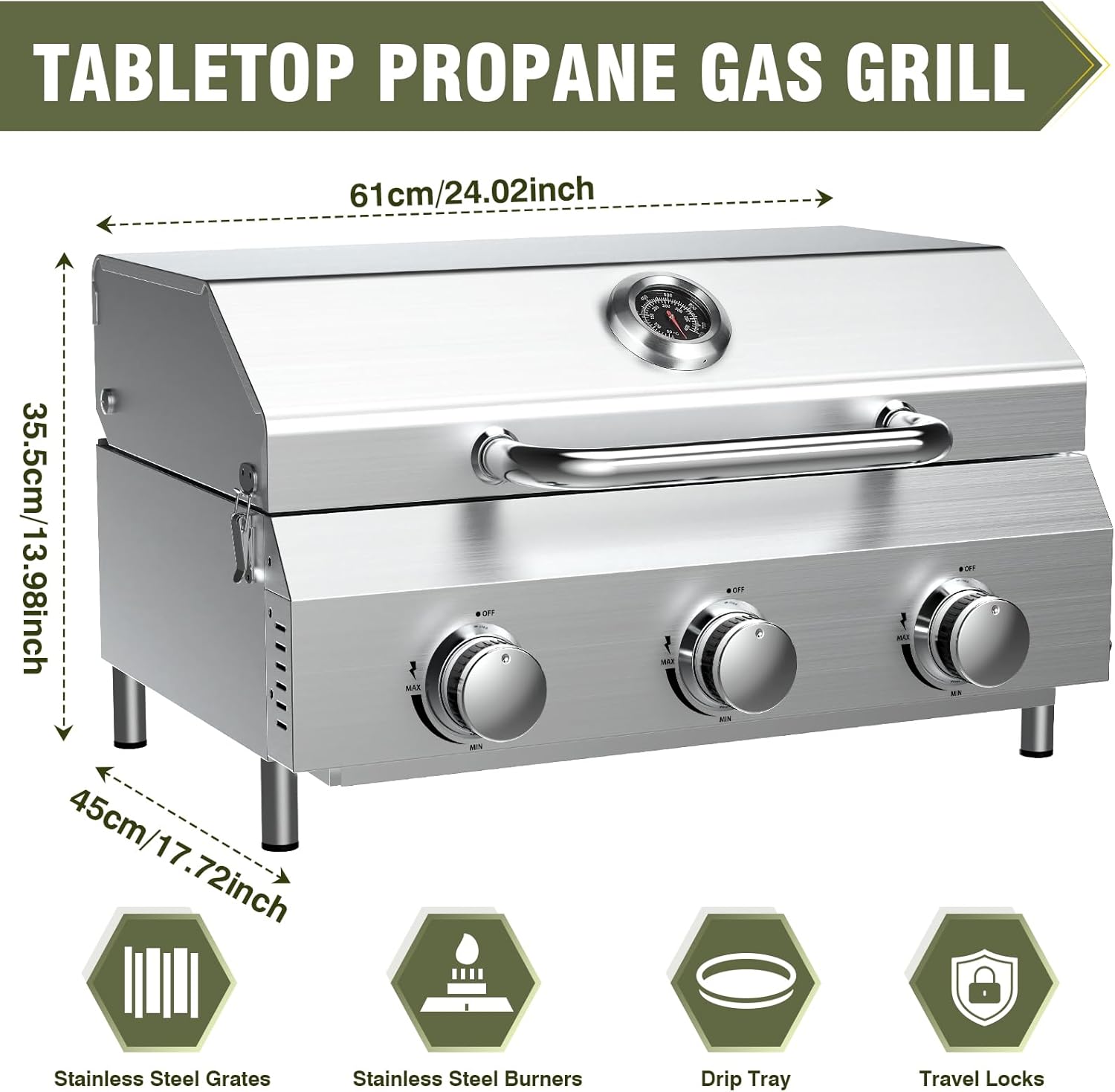 - ☘️【Triple Burner Powerhouse】 Unleash 30,000 BTU grilling force with 3 independent burners. Achieves rapid searing and even heat across the 24-inch thickened stainless steel cooking grate – upgraded for superior heat retention, warp resistance, and heavy food support. Perfect for multi-zone cooking (sear/roast/warm) and feeding crowds. Reduced flare-ups and faster results, whether cooking burgers or brisket.