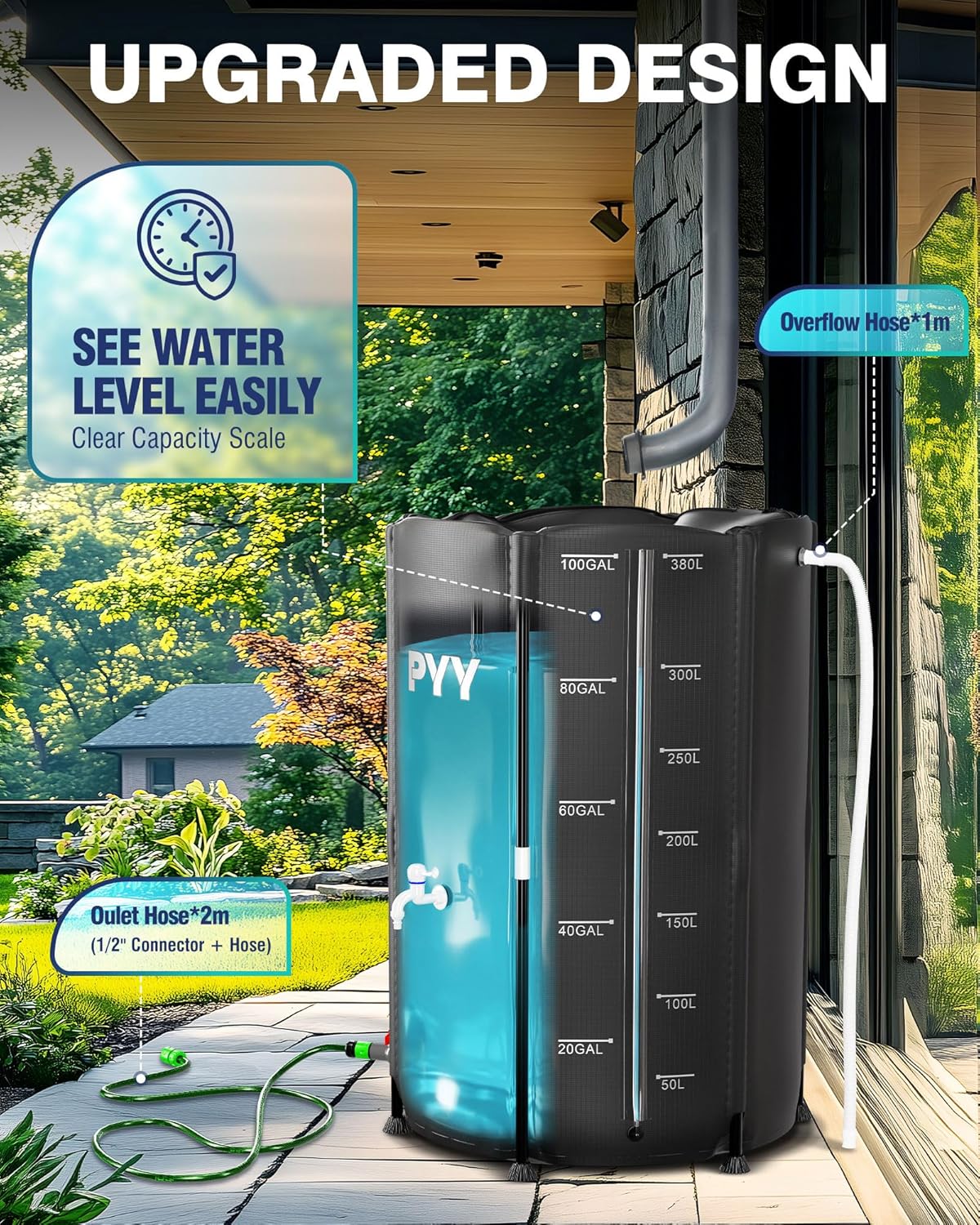 - ๐๐ฎ๐ซ๐๐๐ฅ๐ & ๐๐ญ๐ฎ๐ซ๐๐ฒ: Our rainwater collection barrel is made from high quality 0.5mm thick 1000D PVC, lead-proof, corrosion-resistant, sun-resistant, and crack-resistant. Equipped with 6 robust legs of 1.5mm thickness, the rain storage barrel holds 100 gal water steadily. Enjoy the convenience of irrigation or cleaning in various areas, while our rain water catcher withstands the test of time.