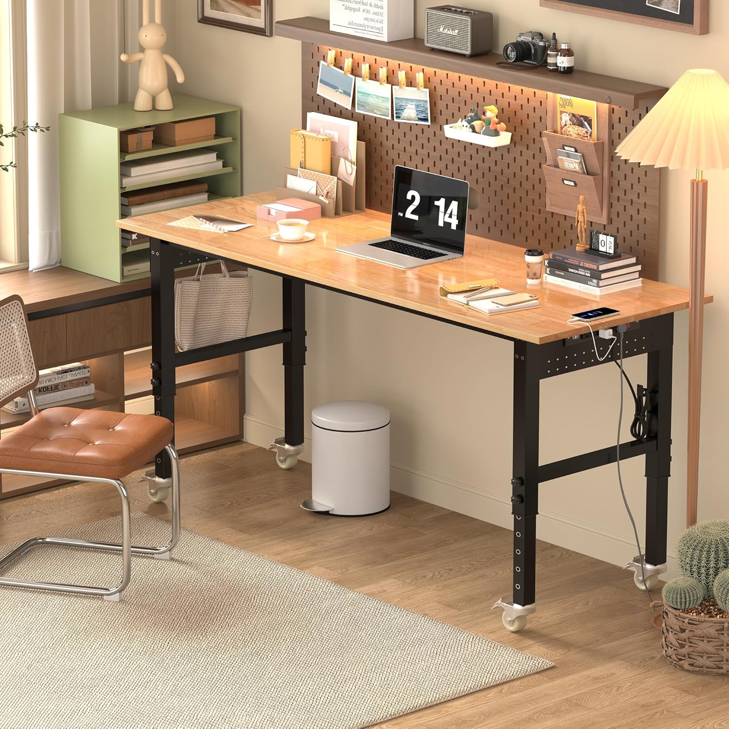 70’’ Work Bench Adjustable Workbench Heavy Duty Work Table with Power outlets, Pegboard, Wheels and Foot Pads, 2000 Lbs Capacity Hardwood Work Benches for Garage, Workshop, Office, Home