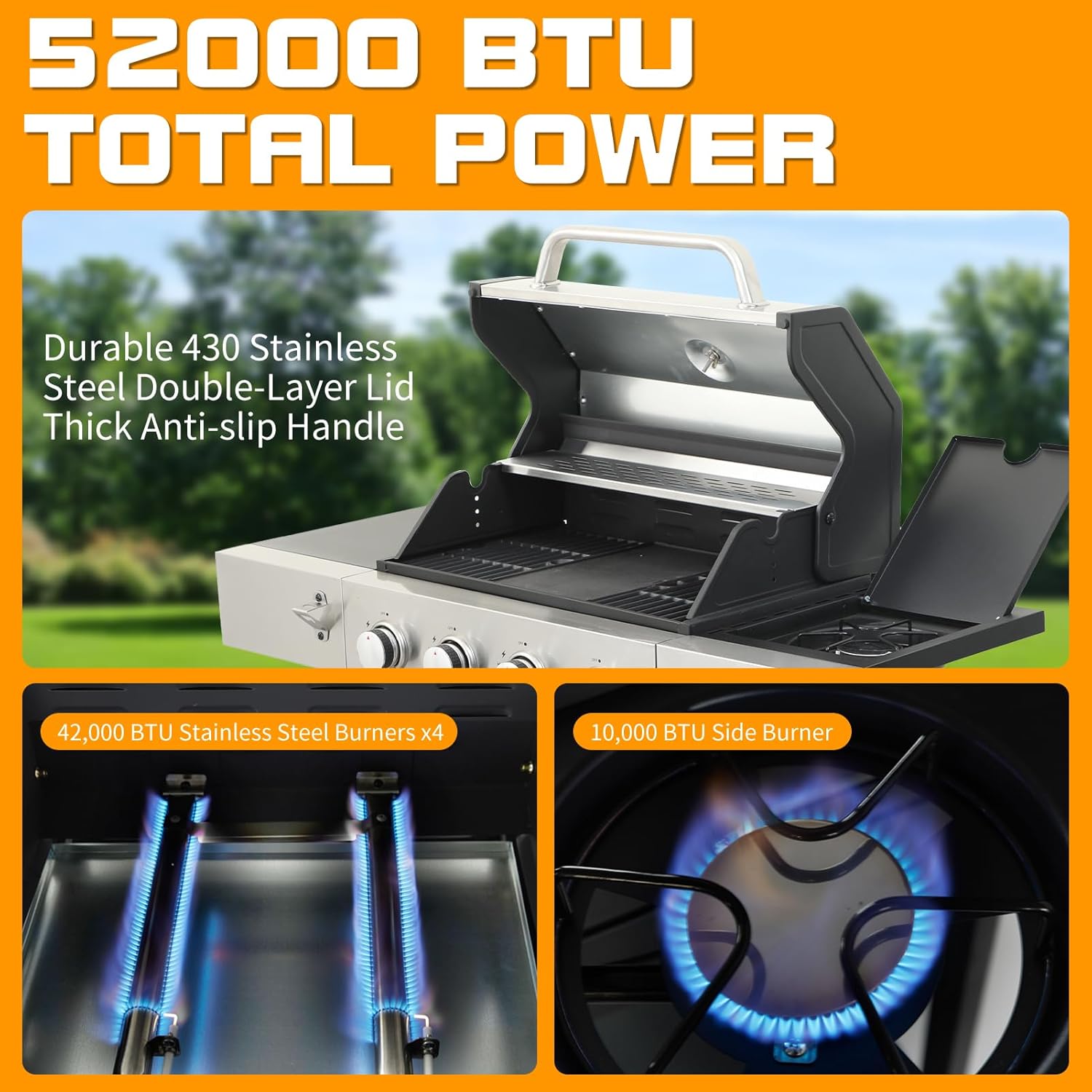 - Multi-Burner Control-52,000 BTU Total:Gas grill with searing burner,four main stainless steel burners(10,500 BTUs each) and a side burner (10,000 BTUs)heats up fast while featuring independent piezo ignition for safe grilling. knob middle with heat-resistant soft rubber ring, ensuring comfortable and safe operation even during extended cooking sessions. High-temperature-resistant (800ยฐC) enamel flame tamper plates distribute heat evenly and built-in thermometer helps monitor internal temperature precisely,perfect for slow roasting or high-heat searing.