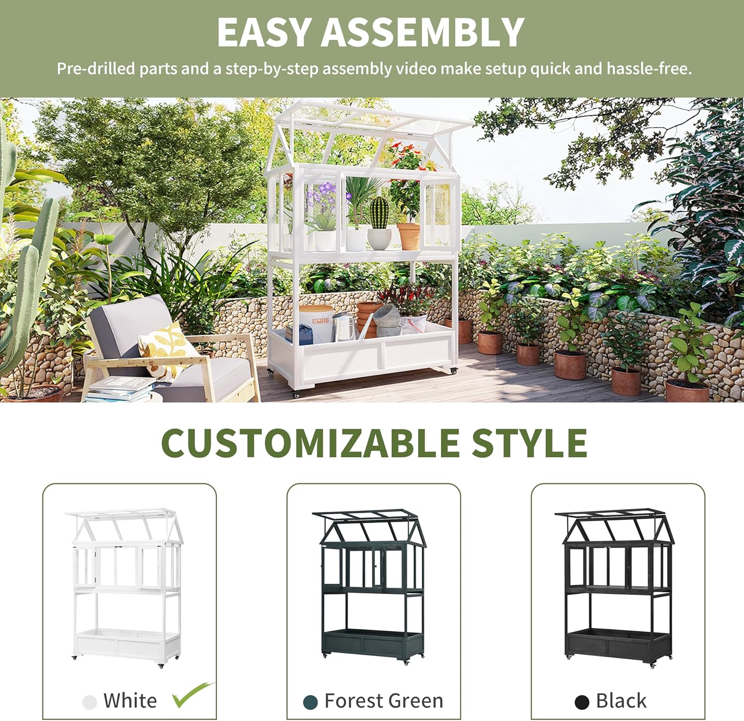 Portable Wooden Cold Frame Greenhouse with Wheels - 47" Mini Greenhouse with Adjustable Roof, Storage Box & Polycarbonate Panels - Plant Protector for Seedlings, Herbs & Winter Gardening (White)