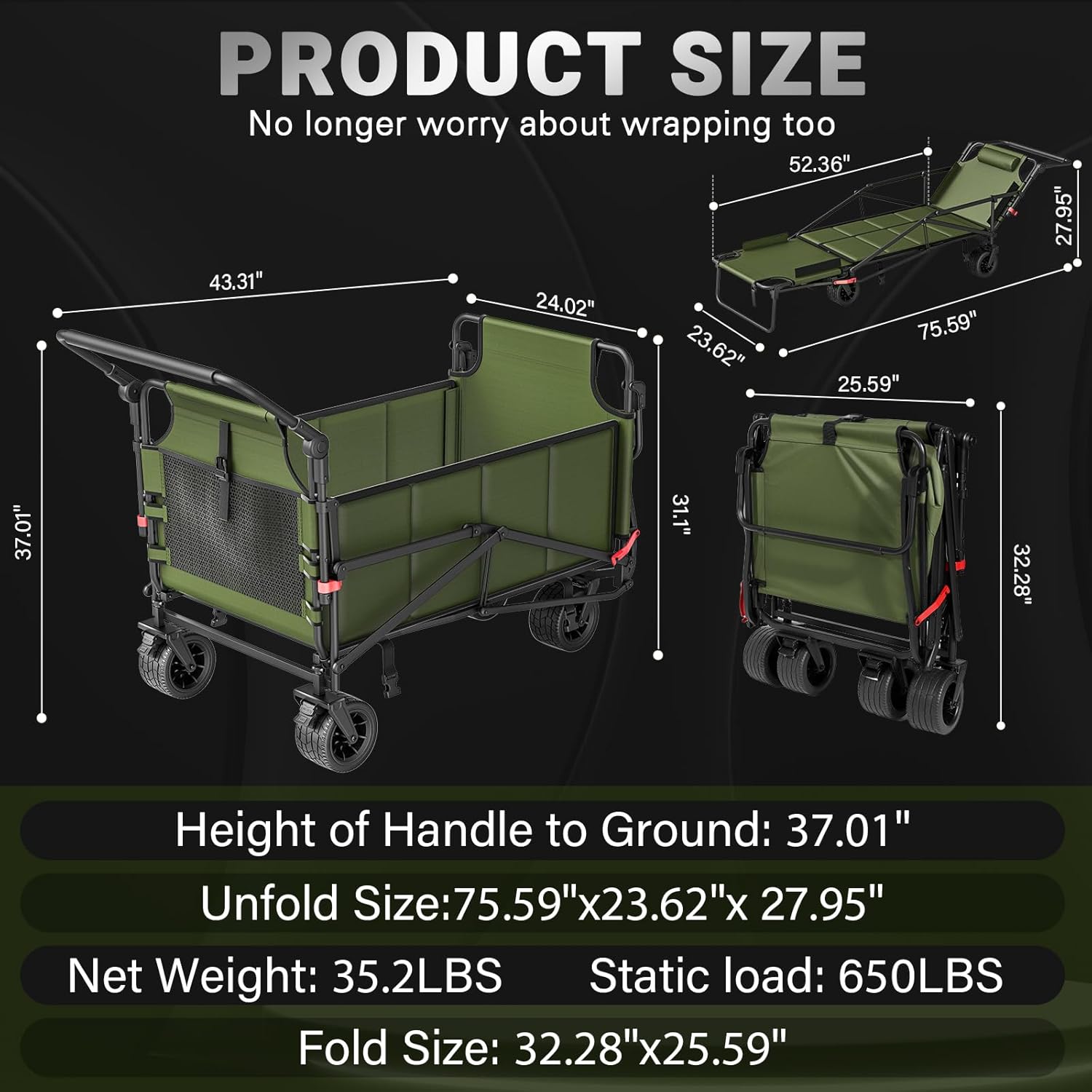 LEVELEVE Heavy Duty Folding Wagon - 2-in-1 Collapsible Cart, 650lb Capacity, All-Terrain Wheels w/Brakes & Side Pockets (Army Green)